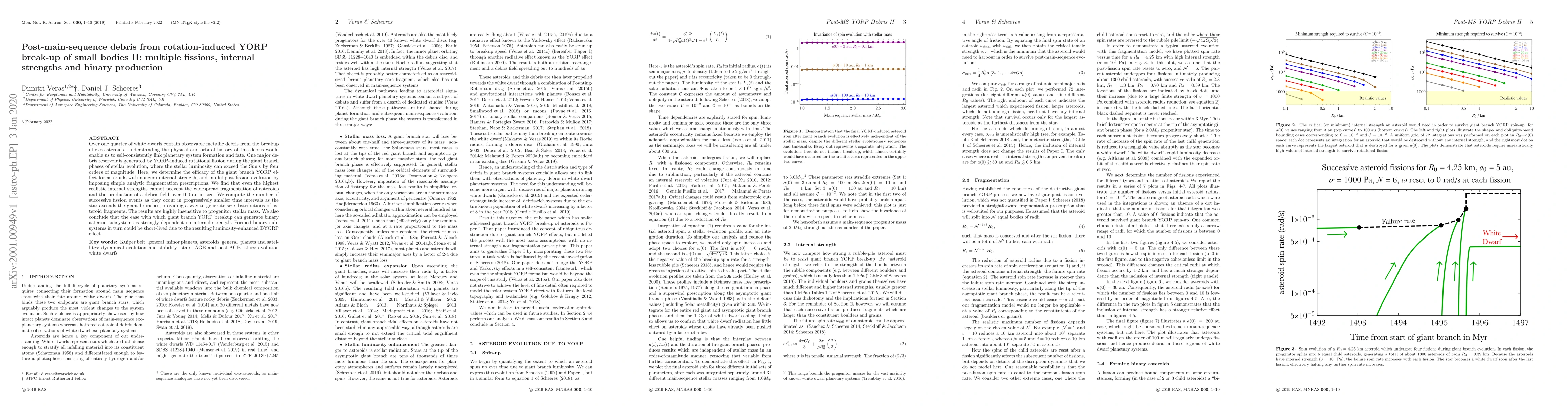 Over one quarter of white dwarfs contain observable metallic debris from the breakup of exo-asteroids. Understanding the physical and orbital history of this debris would enable us to self-consistently link planetary system formation and fate. One major debris reservoir is generated by YORP-induced rotational fission during the giant branch phases of stellar evolution, where the stellar luminosity can exceed the Sun's by four orders of magnitude. Here, we determine the efficacy of the giant branch YORP effect for asteroids with nonzero internal strength, and model post-fission evolution by imposing simple analytic fragmentation prescriptions. We find that even the highest realistic internal strengths cannot prevent the widespread fragmentation of asteroids and the production of a debris field over 100 au in size. We compute the number of successive fission events as they occur in progressively smaller time intervals as the star ascends the giant branches, providing a way to generate size distributions of asteroid fragments. The results are highly insensitive to progenitor stellar mass. We also conclude that the ease with which giant branch YORP breakup can generate binary asteroid subsystems is strongly dependent on internal strength. Formed binary subsystems in turn could be short-lived due to the resulting luminosity-enhanced BYORP effect.
