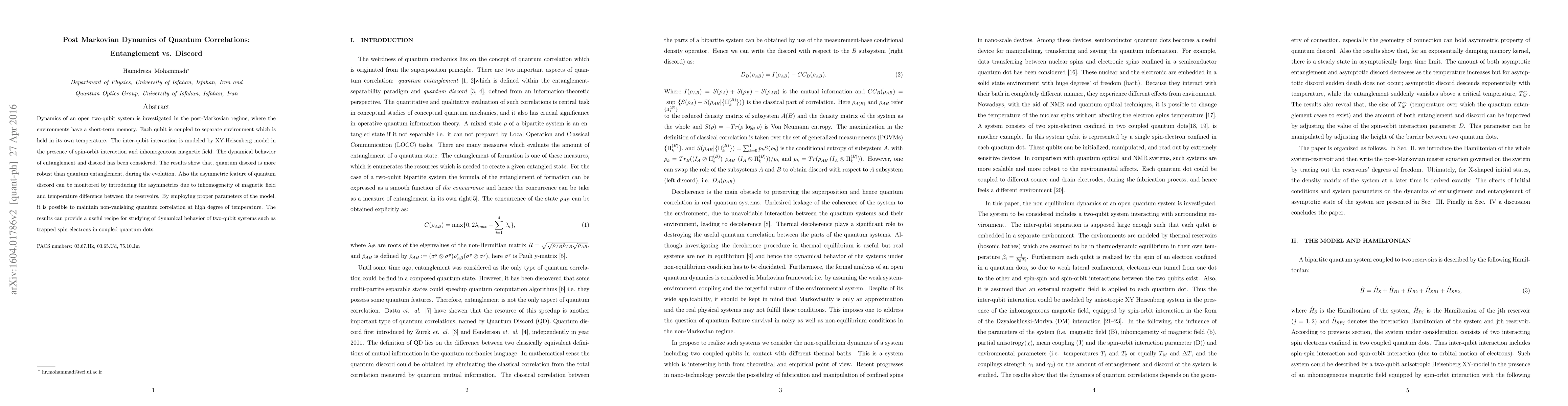 Dynamics of an open two-qubit system is investigated in the post-Markovian regime, where the environments have a short-term memory. Each qubit is coupled to separate environment which is held in its own temperature. The inter-qubit interaction is modeled by XY-Heisenberg model in the presence of spin-orbit interaction and inhomogeneous magnetic field. The dynamical behavior of entanglement and discord has been considered. The results show that, quantum discord is more robust than quantum entanglement, during the evolution. Also the asymmetric feature of quantum discord can be monitored by introducing the asymmetries due to inhomogeneity of magnetic field and temperature difference between the reservoirs. By employing proper parameters of the model, it is possible to maintain non-vanishing quantum correlation at high degree of temperature. The results can provide a useful recipe for studying of dynamical behavior of two-qubit systems such as trapped spin-electrons in coupled quantum dots.