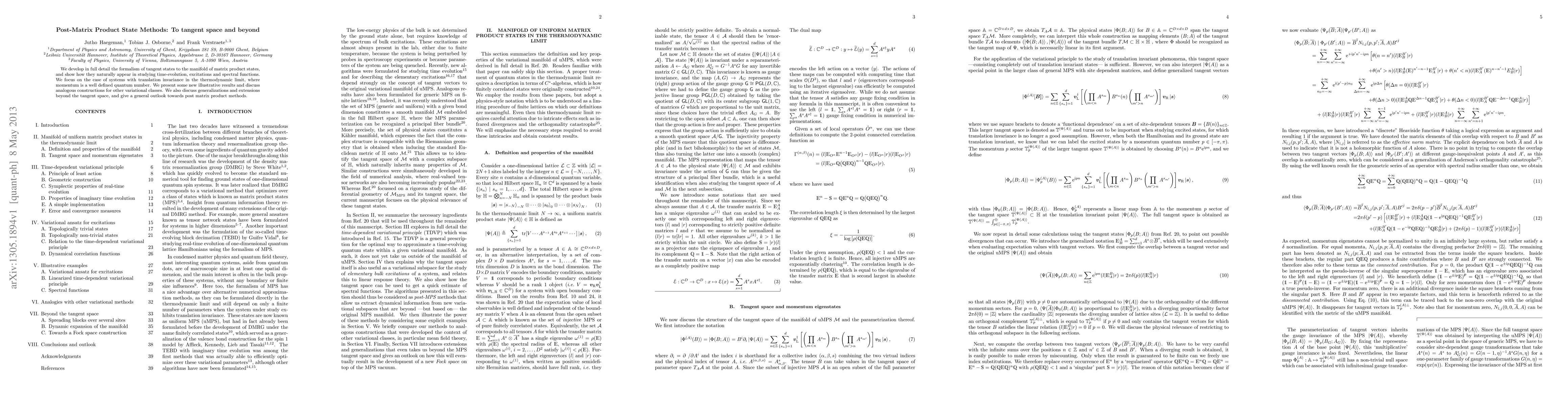 This paper develops a formalism for tangent states to the matrix product state manifold, exploring their application in time-evolution, excitations, and spectral functions, particularly in translationally invariant systems. It also discusses generalizations beyond the tangent space and outlines future directions for post-matrix product state methods.