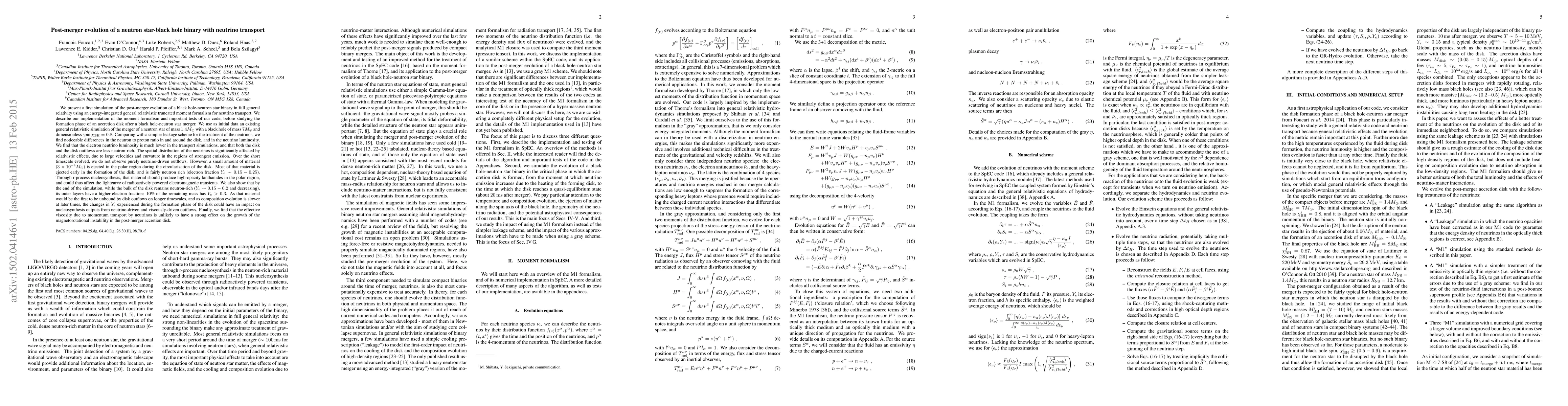This paper simulates the post-merger evolution of a neutron star-black hole binary in full general relativity, incorporating neutrino transport. The study finds significant differences in neutron to proton ratios and neutrino luminosity compared to simpler models, indicating that the remnant is less neutron-rich and that electron neutrino luminosity is lower. The ejected material could affect the lightcurve of electromagnetic transients through r-process nucleosynthesis.