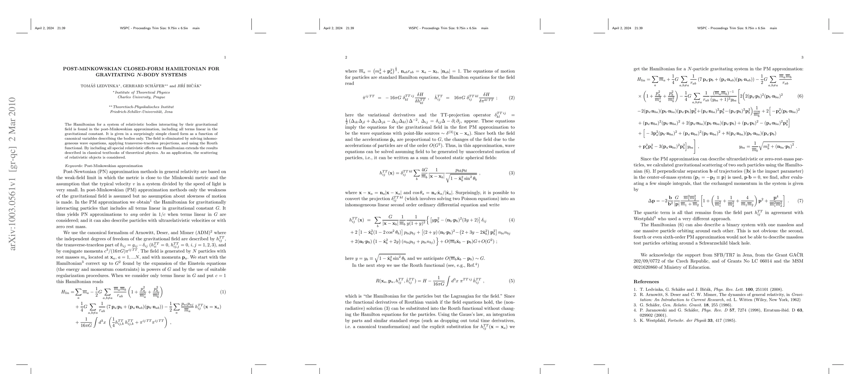 The paper presents a closed-form Hamiltonian for gravitating N-body systems in the post-Minkowskian approximation, encompassing all linear gravitational terms, and applies it to analyze relativistic scattering. The derivation involves solving inhomogeneous wave equations and using the Routh functional.
