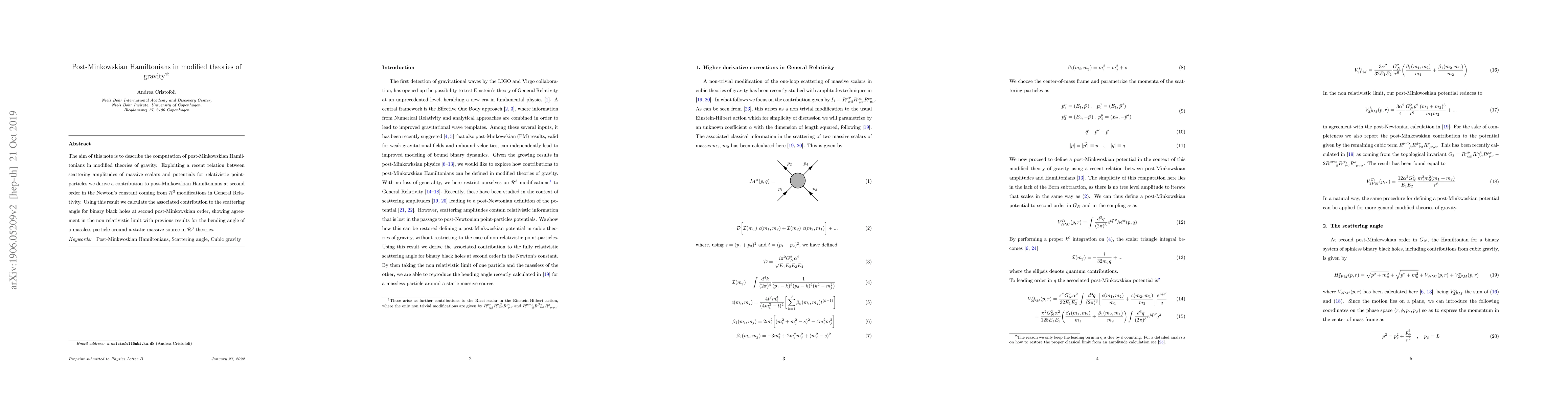 The aim of this note is to describe the computation of post-Minkwoskian Hamiltonians in modified theories of gravity. Exploiting a recent relation between amplitudes of massive scalars and Hamiltonians for relativistic point-particles, we define a post-Minkowskian potential at second order in Newton's constant arising from $\mathcal{R}^3$ modifications in General Relativity. Using this result we calculate the associated contribution to the scattering angle for binary black holes at second post-Minkowskian order, showing agreement in the non relativistic limit with previous results for the bending angle of a massless particle around a static massive source in $\mathcal{R}^3$ theories.