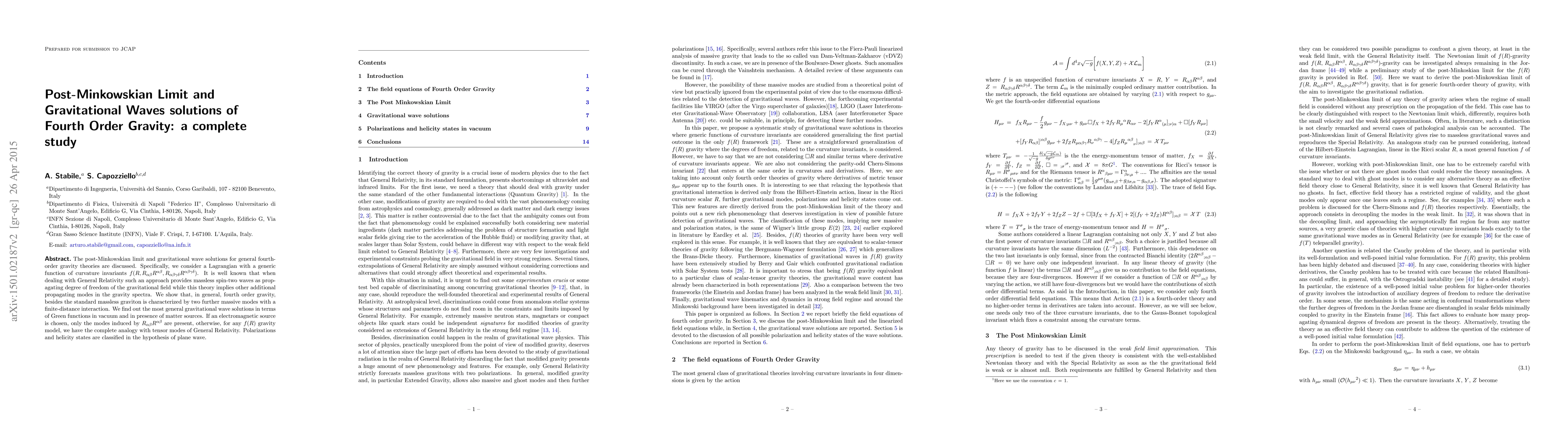 This study investigates fourth-order gravity theories, finding that they produce two massive modes beyond the massless graviton, with implications for gravitational wave solutions and interactions with matter sources.