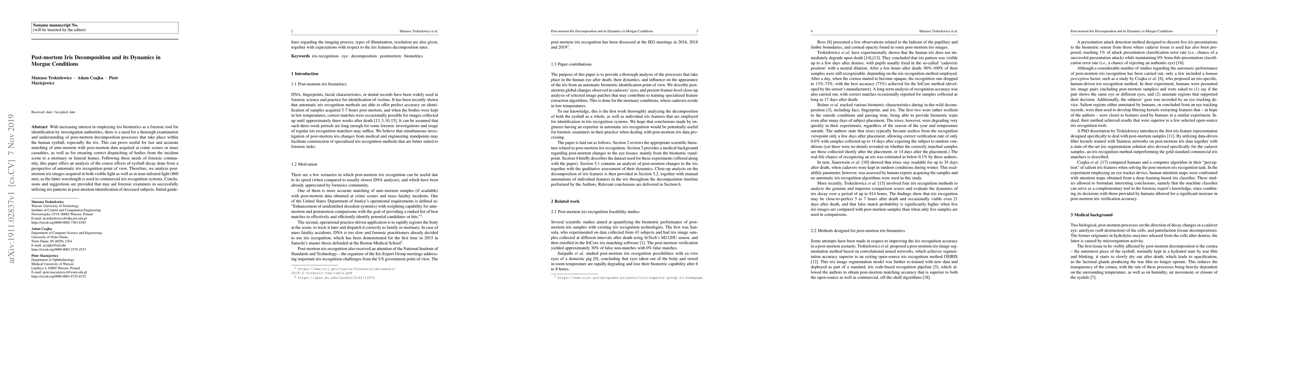 A post-mortem iris recognition system was developed using a combination of machine learning algorithms and image processing techniques.