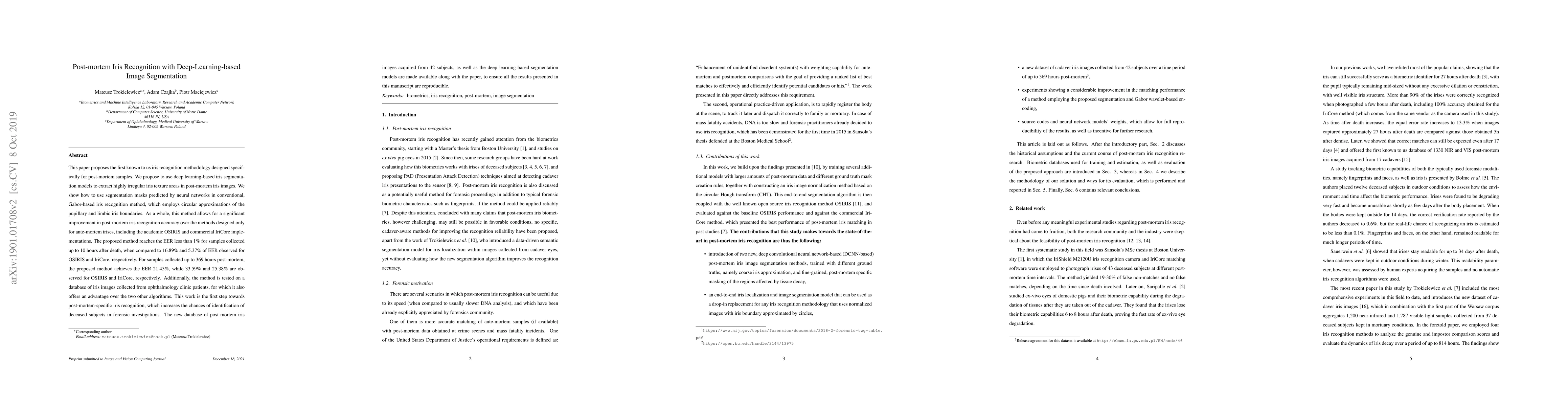 This paper introduces a novel deep-learning-based method for post-mortem iris recognition, significantly improving accuracy over existing ante-mortem methods. The proposed approach uses neural networks for iris segmentation, achieving an Equal Error Rate (EER) below 1% for samples collected up to 10 hours post-mortem and 21.45% for samples up to 369 hours post-mortem.