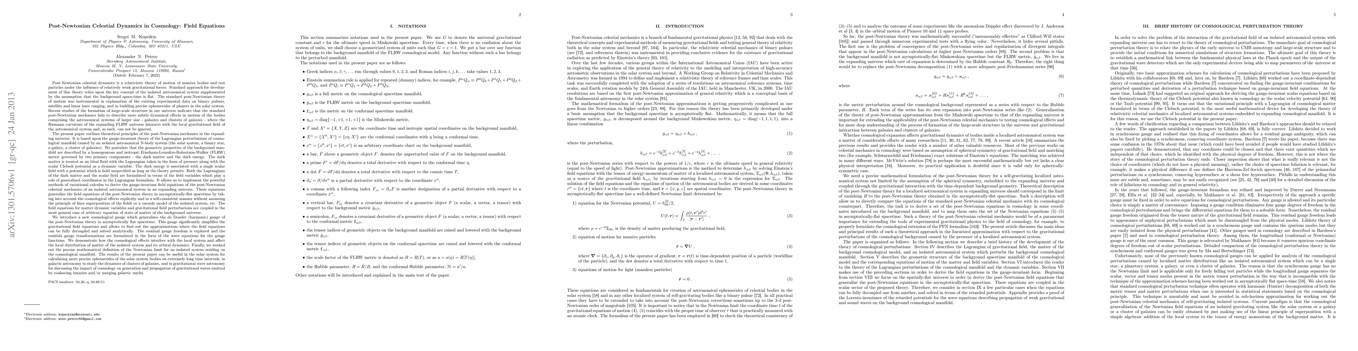 The present paper outlines theoretical principles of the post-Newtonian mechanics in the expanding universe. It is based upon the gauge-invariant theory of the Lagrangian perturbations of cosmological manifold caused by an isolated astronomical N-body system. We postulate that the background manifold is described by Friedman-Lemaitre-Robertson-Walker (FLRW) metric governed by two primary components - the dark matter and the dark energy. The dark matter is treated as an ideal fluid. The dark energy is described by a single scalar field with a potential which is hold unspecified as long as the theory permits. The Lagrangian of the dark matter and that of the scalar field are formulated in terms of the field variables. We use variational calculus to derive the gauge-invariant field equations of the post-Newtonian celestial mechanics of an isolated astronomical system in an expanding universe. These equations generalize the field equations of the post-Newtonian theory in asymptotically-flat spacetime by taking into account the cosmological effects explicitly. We introduce a new cosmological gauge which generalizes the harmonic gauge of the post-Newtonian theory in asymptotically-flat spacetime. This gauge significantly simplifies the gravitational field equations and allows finding out the approximations where the field equations can be fully decoupled and solved analytically. The residual gauge freedom is explored. The results of the present paper can be useful in the solar system for calculating more precise ephemerides of the solar system bodies on extremely long time intervals, in galactic astronomy to study the dynamics of clusters of galaxies, and in gravitational wave astronomy for discussing the impact of cosmology on generation and propagation of gravitational waves emitted by coalescing binaries and/or merging galactic nuclei.