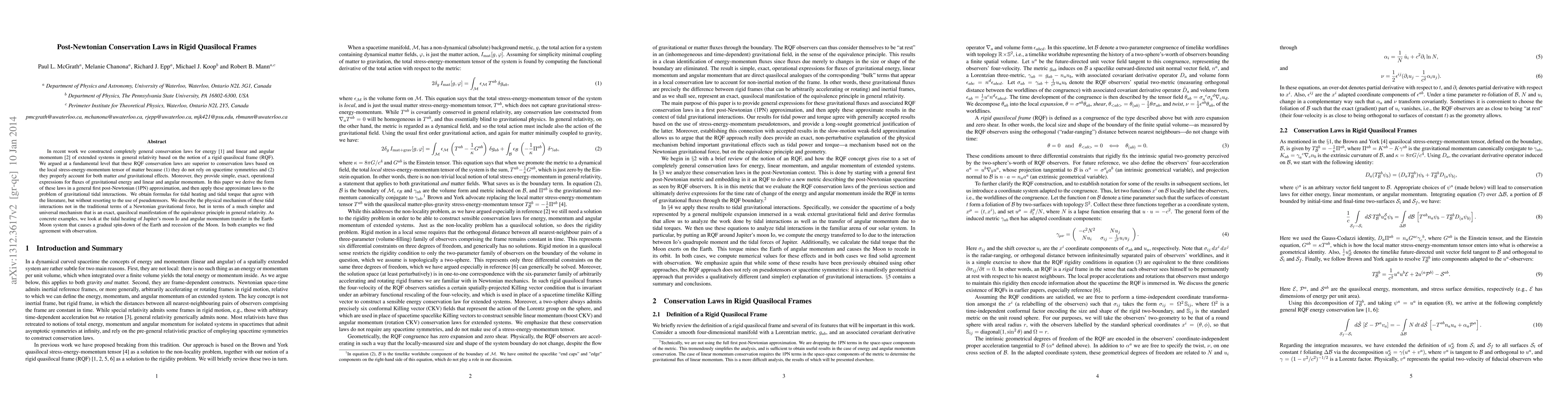 This paper develops post-Newtonian conservation laws for energy, linear, and angular momentum in general relativity using rigid quasilocal frames, showing they are superior to local stress-energy-momentum tensors. It applies these laws to gravitational tidal interactions, providing exact quasilocal expressions for tidal heating and torque without pseudotensors, and demonstrates their accuracy through examples like Io and the Earth-Moon system.