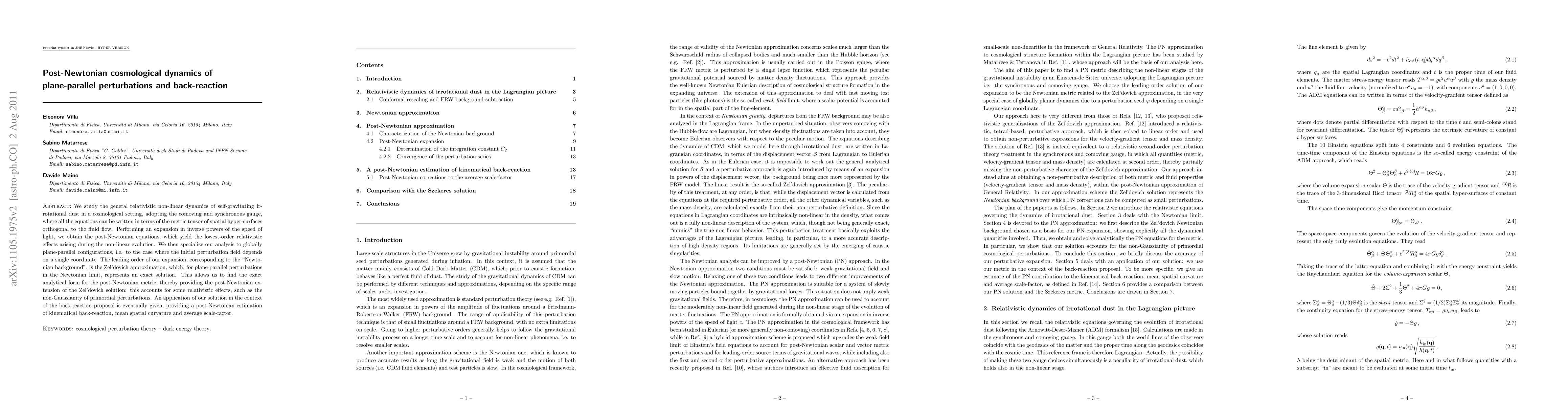 This paper investigates the general relativistic dynamics of plane-parallel perturbations in self-gravitating dust, deriving post-Newtonian equations that capture the lowest-order relativistic effects. It extends the Zel'dovich approximation to the post-Newtonian regime, providing an analytical solution that accounts for relativistic effects like non-Gaussianity, and applies this to estimate kinematical back-reaction and mean spatial curvature.