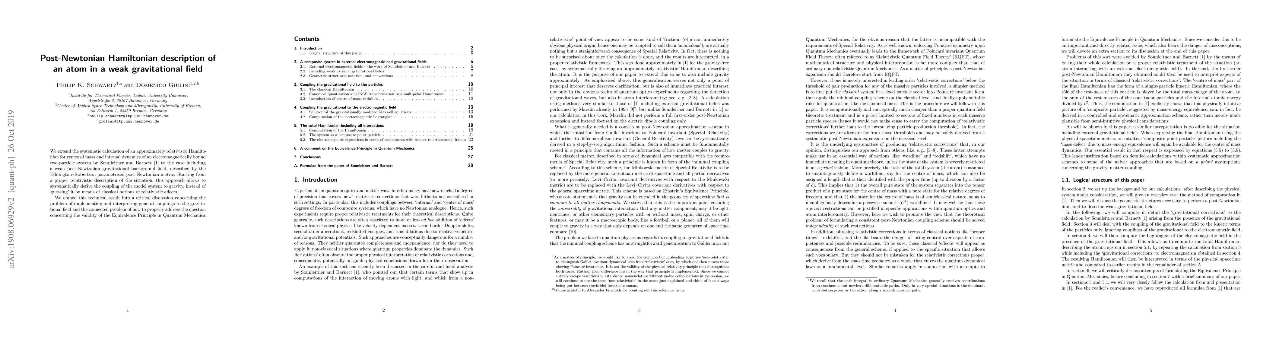 We extend the systematic calculation of an approximately relativistic Hamiltonian for centre of mass and internal dynamics of an electromagnetically bound two-particle system by Sonnleitner and Barnett [1] to the case including a weak post-Newtonian gravitational background field, described by the Eddington--Robertson parametrised post-Newtonian metric. Starting from a proper relativistic description of the situation, this approach allows to systematically derive the coupling of the model system to gravity, instead of `guessing' it by means of classical notions of relativistic effects. We embed this technical result into a critical discussion concerning the problem of implementing and interpreting general couplings to the gravitational field and the connected problem of how to properly address the question concerning the validity of the Equivalence Principle in Quantum Mechanics.