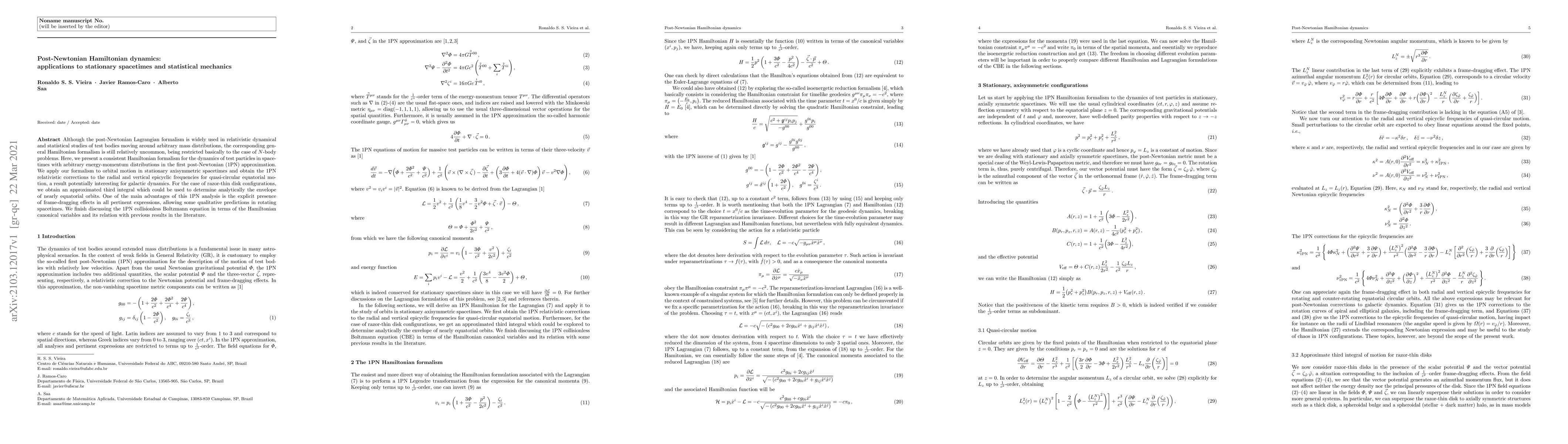 Although the post-Newtonian Lagrangian formalism is widely used in relativistic dynamical and statistical studies of test bodies moving around arbitrary mass distributions, the corresponding general Hamiltonian formalism is still relatively uncommon, being restricted basically to the case of N-body problems. Here, we present a consistent Hamiltonian formalism for the dynamics of test particles in spacetimes with arbitrary energy-momentum distributions in the first post-Newtonian (1PN) approximation. We apply our formalism to orbital motion in stationary axisymmetric spacetimes and obtain the 1PN relativistic corrections to the radial and vertical epicyclic frequencies for quasi-circular equatorial motion, a result potentially interesting for galactic dynamics. For the case of razor-thin disk configurations, we obtain an approximated third integral which could be used to determine analytically the envelope of nearly equatorial orbits. One of the main advantages of this 1PN analysis is the explicit presence of frame-dragging effects in all pertinent expressions, allowing some qualitative predictions in rotating spacetimes. We finish discussing the 1PN collisionless Boltzmann equation in terms of the Hamiltonian canonical variables and its relation with previous results in the literature.