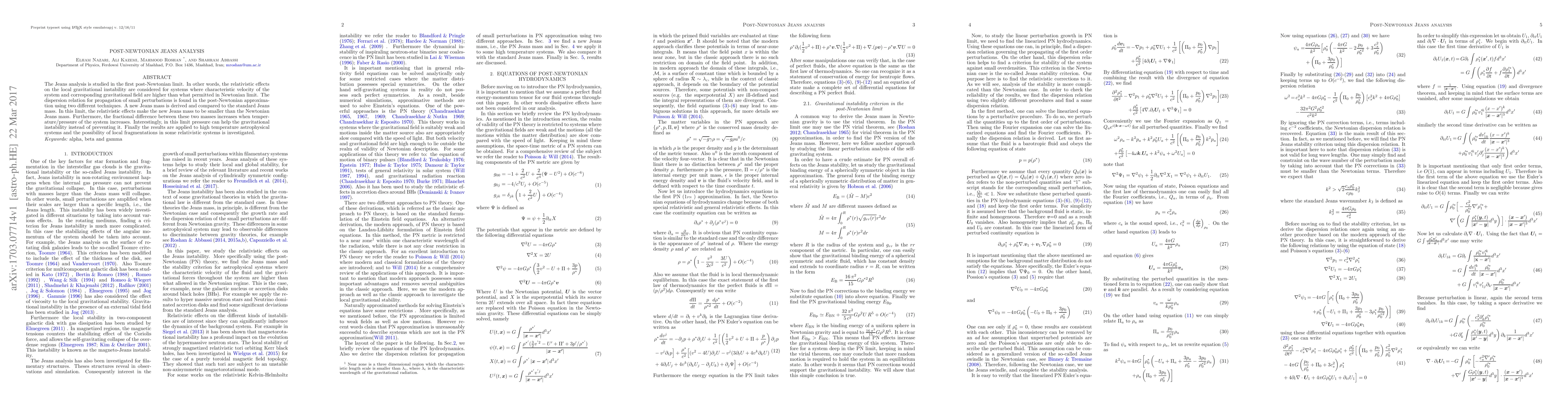 The Jeans analysis is studied in the first post-Newtonian limit. In other words, the relativistic effects on the local gravitational instability are considered for systems where characteristic velocity of the system and corresponding gravitational field are higher than what permitted in Newtonian limit. The dispersion relation for propagation of small perturbations is found in the post-Newtonian approximation using two different techniques. A new Jeans mass is derived and compared to the standard Jeans mass. In this limit, the relativistic effects make the new Jeans mass to be smaller than the Newtonian Jeans mass. Furthermore, the fractional difference between these two masses increases when temperature/pressure of the system increases. Interestingly, in this limit pressure can help the gravitational instability instead of preventing it. Finally the results are applied to high temperature astrophysical systems and the possibility of local fragmentations in some relativistic systems is investigated.