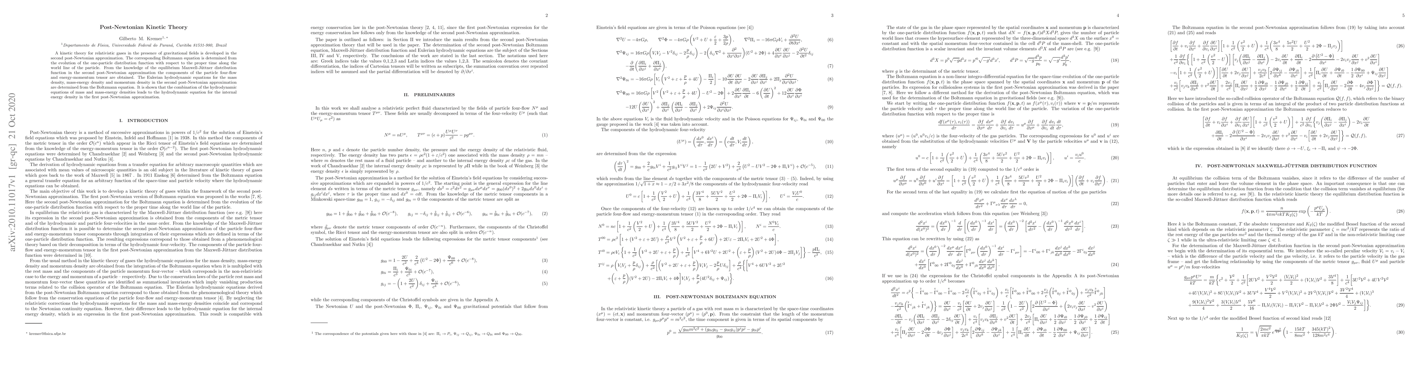 This paper develops a kinetic theory for relativistic gases under gravitational fields in the second post-Newtonian approximation, deriving the corresponding Boltzmann equation and determining the Eulerian hydrodynamic equations for mass, mass-energy, and momentum densities, while also linking the hydrodynamic equations to the internal energy density.