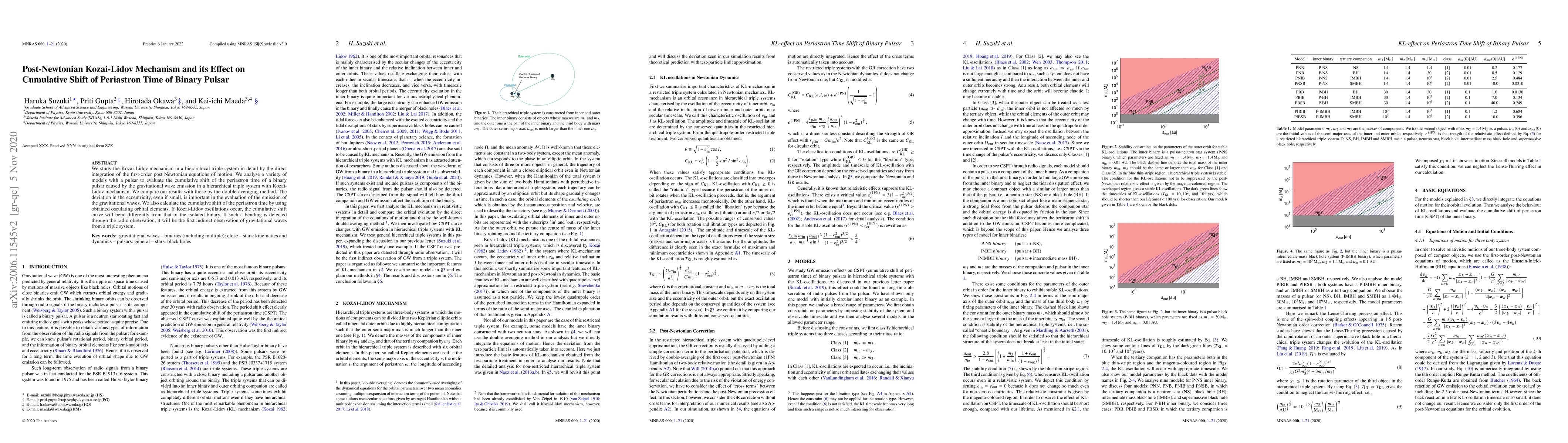 This paper investigates the Kozai-Lidov mechanism in hierarchical triple systems using post-Newtonian equations, focusing on the cumulative shift in the periastron time of binary pulsars. The results show significant deviations in eccentricity, crucial for gravitational wave emission, and suggest that detecting bending in the cumulative shift curve could indicate gravitational waves from triple systems.