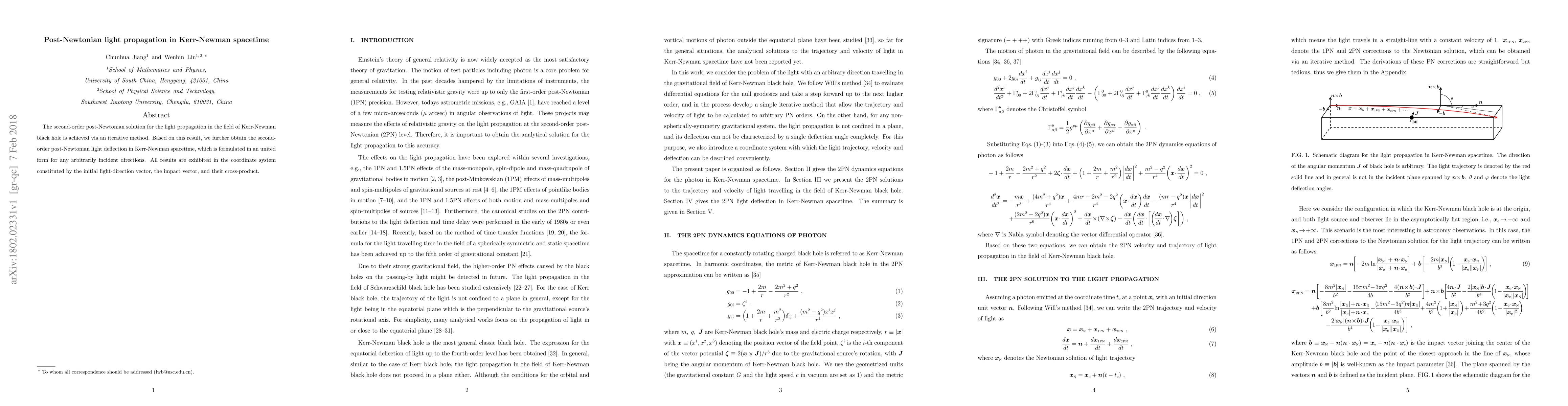 The second-order post-Newtonian solution for the light propagation in the field of Kerr-Newman black hole is achieved via an iterative method. Based on this result, we further obtain the second-order post-Newtonian light deflection in Kerr-Newman spacetime, which is formulated in an united form for any arbitrarily incident directions. All results are exhibited in the coordinate system constituted by the initial light-direction vector, the impact vector, and their cross-product.