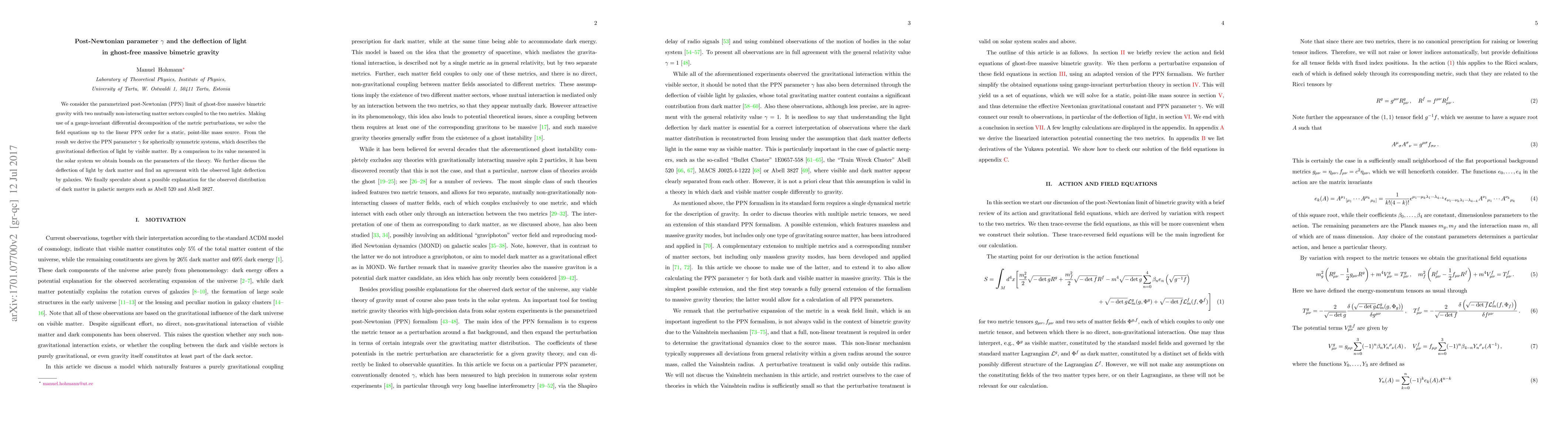 This paper investigates the parametrized post-Newtonian (PPN) limit of ghost-free massive bimetric gravity, determining the PPN parameter $\gamma$ that describes light deflection by visible and dark matter. The study finds agreement between theoretical predictions and observed galactic light deflection, and suggests possible implications for dark matter distribution in galactic mergers.