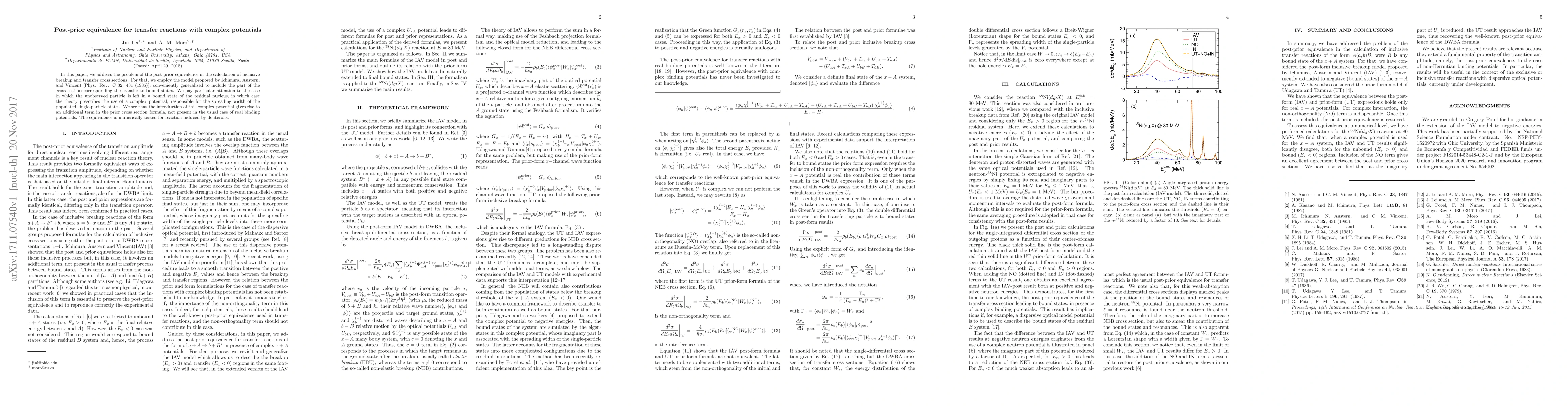 In this paper, we address the problem of the post-prior equivalence in the calculation of inclusive breakup and transfer cross sections. For that, we employ the model proposed by Ichimura, Austern, and Vincent [Phys. Rev. C 32, 431 (1985)], conveniently generalized to include the part of the cross section corresponding the transfer to bound states. We pay particular attention to the case in which the unobserved particle is left in a bound state of the residual nucleus, in which case the theory prescribes the use of a complex potential, responsible for the spreading width of the populated single-particle states. We see that the introduction of this complex potential gives rise to an additional term in the prior cross section formula, not present in the usual case of real binding potentials. The equivalence is numerically tested for reaction induced by deuterons.