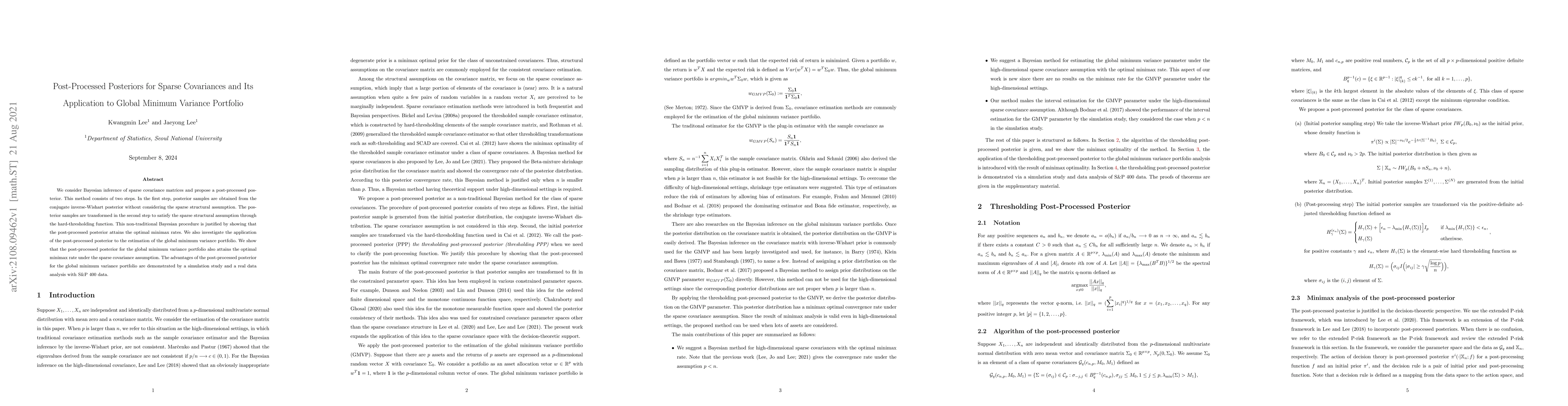 This paper proposes a post-processed posterior method for inferring sparse covariance matrices, achieving optimal minimax rates. It applies this method to estimate the global minimum variance portfolio, demonstrating its effectiveness through simulations and real-world data analysis.