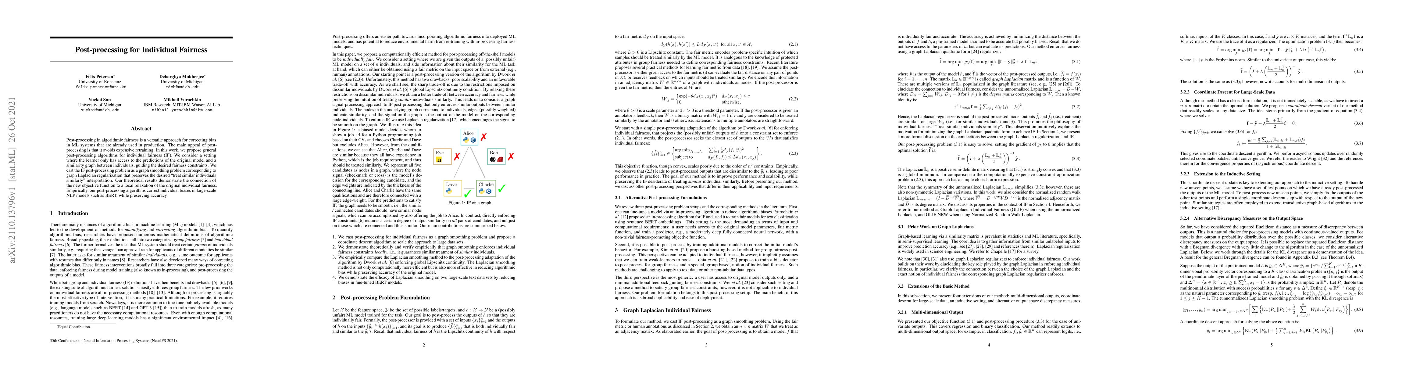 This paper proposes post-processing algorithms for individual fairness that correct bias in existing ML models without retraining. It frames the problem as a graph smoothing task and demonstrates that the approach effectively reduces individual biases in large-scale NLP models like BERT while maintaining accuracy.