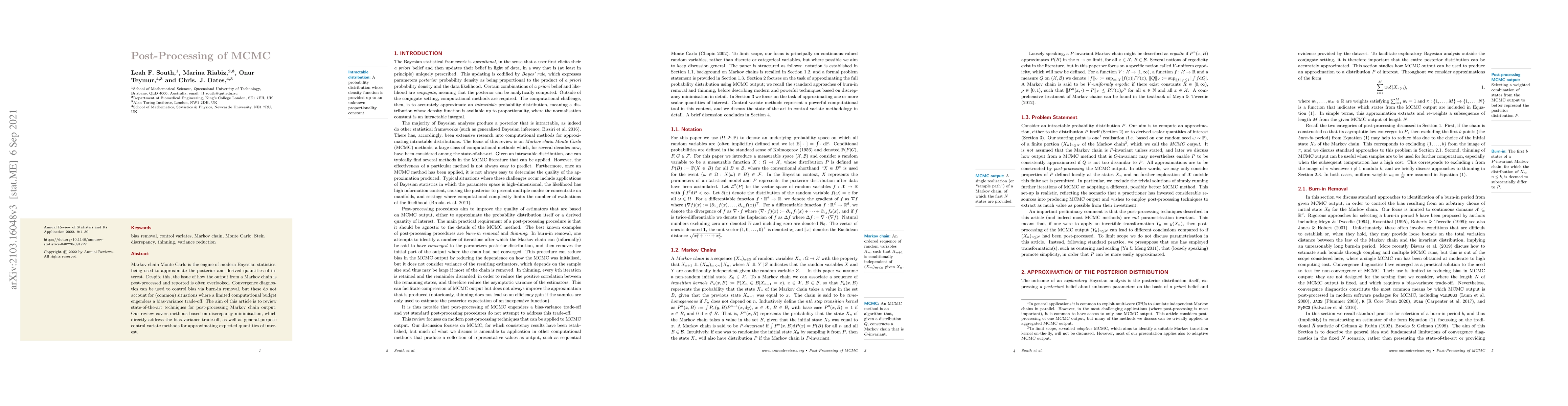 This paper reviews advanced techniques for post-processing Markov chain Monte Carlo (MCMC) output, focusing on methods that minimize bias-variance trade-offs and control variate approaches for estimating expected quantities, addressing often-overlooked issues in Bayesian statistics.