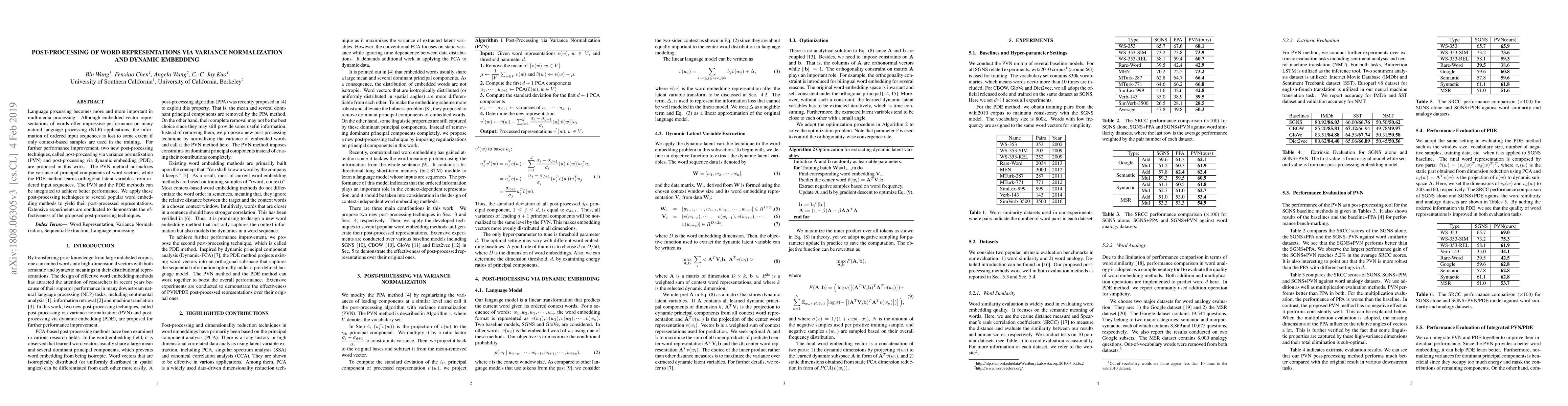 This paper proposes two post-processing techniques—variance normalization (PVN) and dynamic embedding (PDE)—to enhance word representations from word2vec and GloVe. PVN normalizes the variance of principal components, while PDE learns orthogonal latent variables from input sequences, achieving better performance when combined.