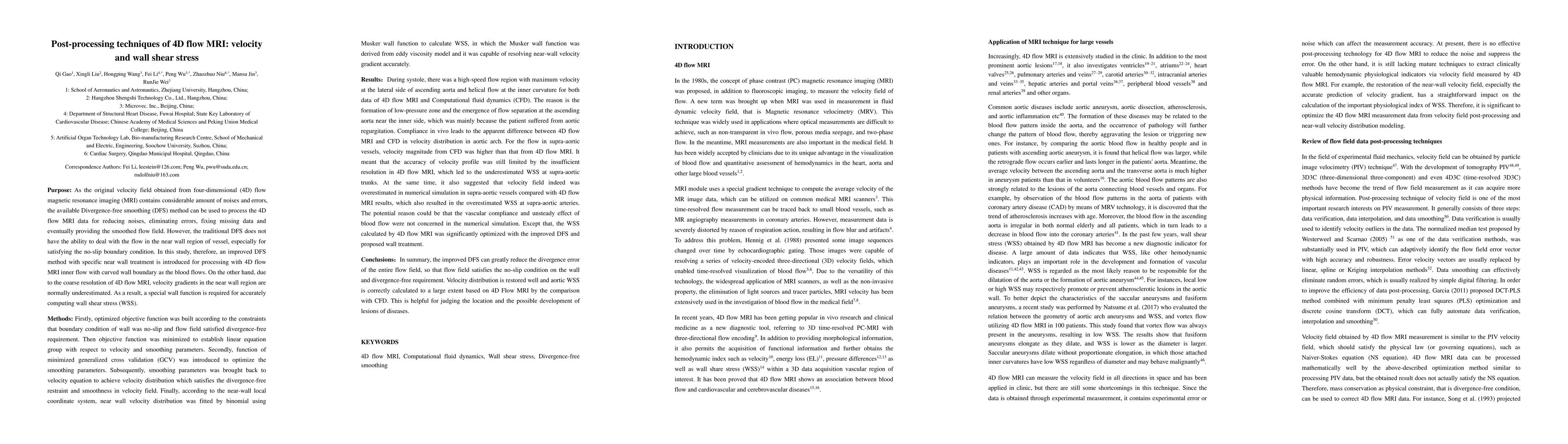 As the original velocity field obtained from four-dimensional (4D) flow magnetic resonance imaging (MRI) contains considerable amount of noises and errors, the available Divergence-free smoothing (DFS) method can be used to process the 4D flow MRI data for reducing noises, eliminating errors, fixing missing data and eventually providing the smoothed flow field. However, the traditional DFS does not have the ability to deal with the flow in the near wall region of vessel, especially for satisfying the no-slip boundary condition. In this study, therefore, an improved DFS method with specific near wall treatment is introduced for processing with 4D flow MRI inner flow with curved wall boundary as the blood flows. On the other hand, due to the coarse resolution of 4D flow MRI, velocity gradients in the near wall region are normally underestimated. As a result, a special wall function is required for accurately computing wall shear stress (WSS).
