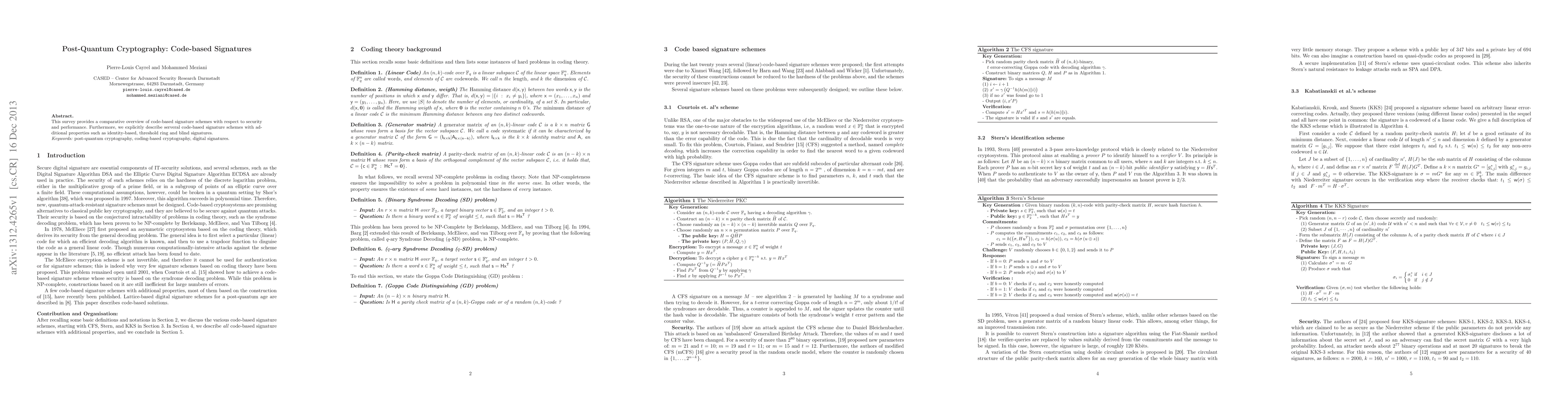 This survey compares code-based signature schemes based on their security and performance, highlighting several schemes with advanced properties like identity-based, threshold ring, and blind signatures.