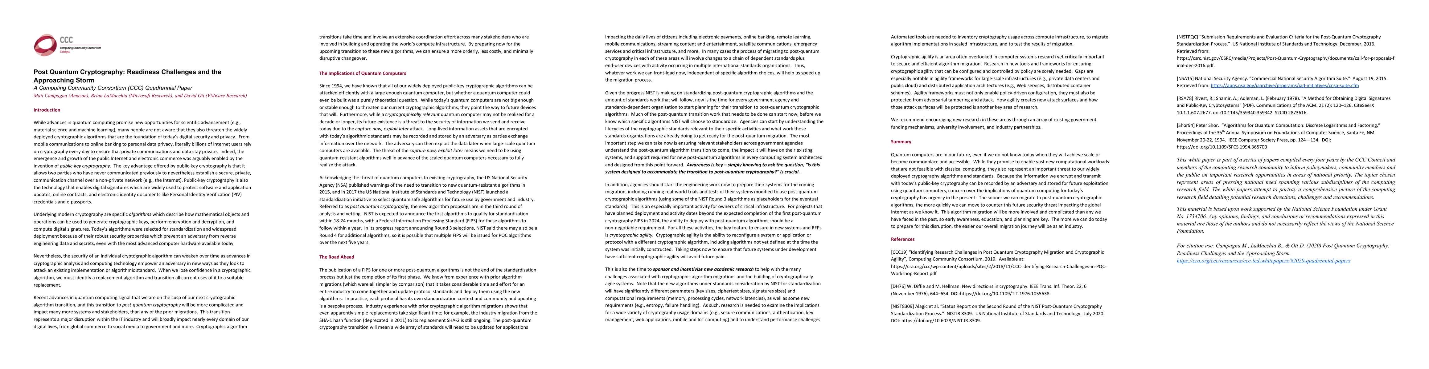 While advances in quantum computing promise new opportunities for scientific advancement (e.g., material science and machine learning), many people are not aware that they also threaten the widely deployed cryptographic algorithms that are the foundation of today's digital security and privacy. From mobile communications to online banking to personal data privacy, literally billions of Internet users rely on cryptography every day to ensure that private communications and data stay private. Indeed, the emergence and growth of the public Internet and electronic commerce was arguably enabled by the invention of public-key cryptography. The key advantage offered by public-key cryptography is that it allows two parties who have never communicated previously to nevertheless establish a secure, private, communication channel over a non-private network (e.g., the Internet). Recent advances in quantum computing signal that we are on the cusp of our next cryptographic algorithm transition, and this transition to post-quantum cryptography will be more complicated and impact many more systems and stakeholders, than any of the prior migrations. This transition represents a major disruption within the IT industry and will broadly impact nearly every domain of our digital lives, from global commerce to social media to government and more. Cryptographic algorithm transitions take time and involve an extensive coordination effort across many stakeholders who are involved in building and operating the world's compute infrastructure. By preparing now for the upcoming transition to these new algorithms, we can ensure a more orderly, less costly, and minimally disruptive changeover.