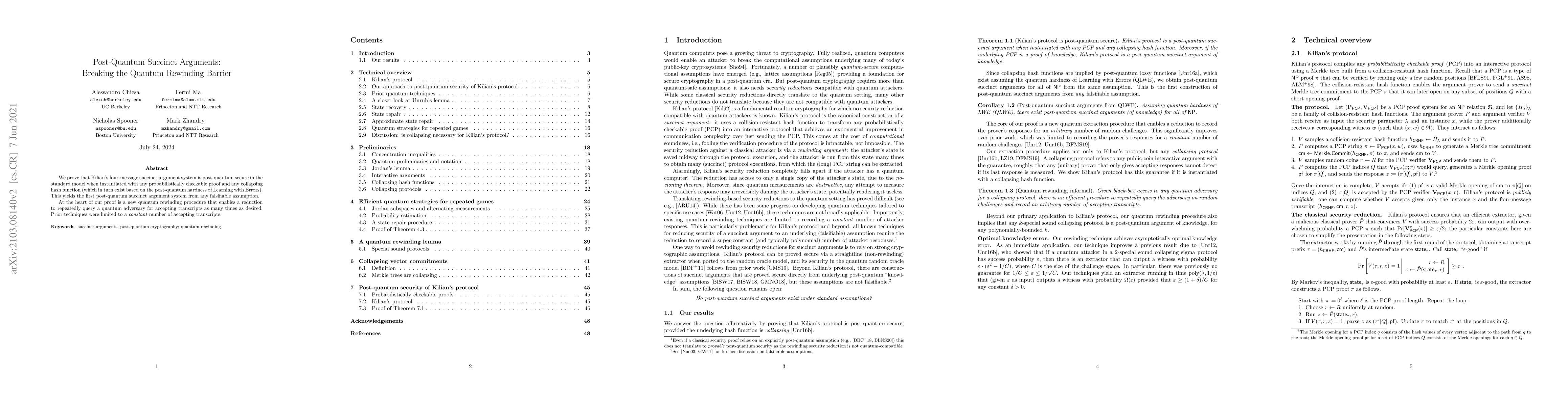 This paper demonstrates the post-quantum security of Kilian's four-message succinct argument system using probabilistically checkable proofs and collapsing hash functions based on the hardness of Learning with Errors. The novel quantum rewinding procedure allows for repeated queries to a quantum adversary, overcoming previous limitations to a constant number of queries.