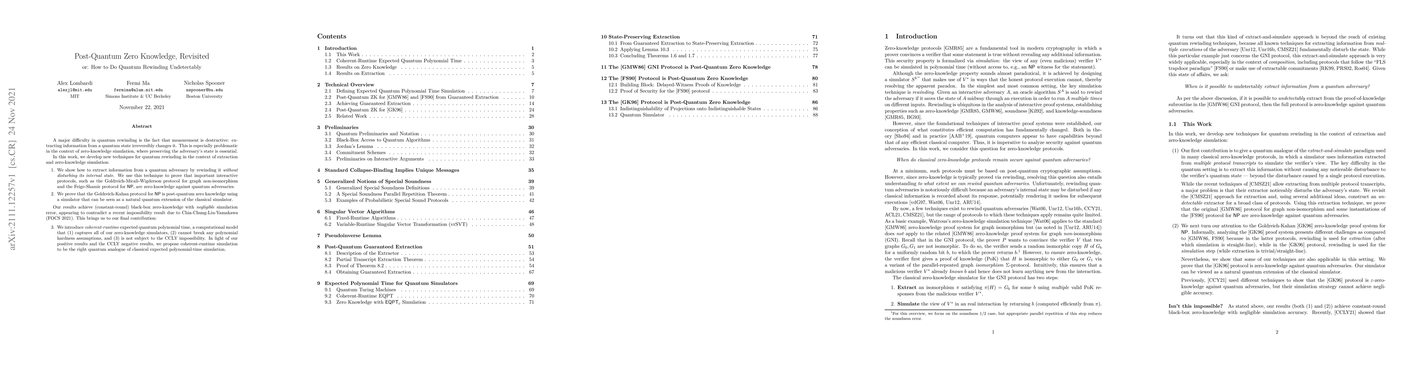 A major difficulty in quantum rewinding is the fact that measurement is destructive: extracting information from a quantum state irreversibly changes it. This is especially problematic in the context of zero-knowledge simulation, where preserving the adversary's state is essential. In this work, we develop new techniques for quantum rewinding in the context of extraction and zero-knowledge simulation: (1) We show how to extract information from a quantum adversary by rewinding it without disturbing its internal state. We use this technique to prove that important interactive protocols, such as the Goldreich-Micali-Wigderson protocol for graph non-isomorphism and the Feige-Shamir protocol for NP, are zero-knowledge against quantum adversaries. (2) We prove that the Goldreich-Kahan protocol for NP is post-quantum zero knowledge using a simulator that can be seen as a natural quantum extension of the classical simulator. Our results achieve (constant-round) black-box zero-knowledge with negligible simulation error, appearing to contradict a recent impossibility result due to Chia-Chung-Liu-Yamakawa (FOCS 2021). This brings us to our final contribution: (3) We introduce coherent-runtime expected quantum polynomial time, a computational model that (a) captures all of our zero-knowledge simulators, (b) cannot break any polynomial hardness assumptions, and (c) is not subject to the CCLY impossibility. In light of our positive results and the CCLY negative results, we propose coherent-runtime simulation to be the right quantum analogue of classical expected polynomial-time simulation.