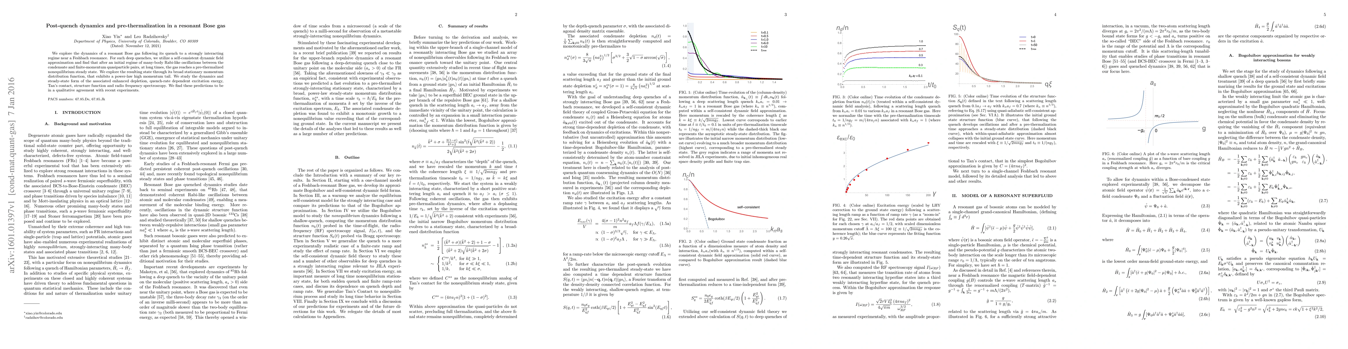 This research investigates the dynamics of a resonant Bose gas after a deep quench into a strongly interacting regime, revealing many-body oscillations and eventual pre-thermalization. The study finds a power-law momentum tail in the stationary distribution and correlates these findings with experimental observations.