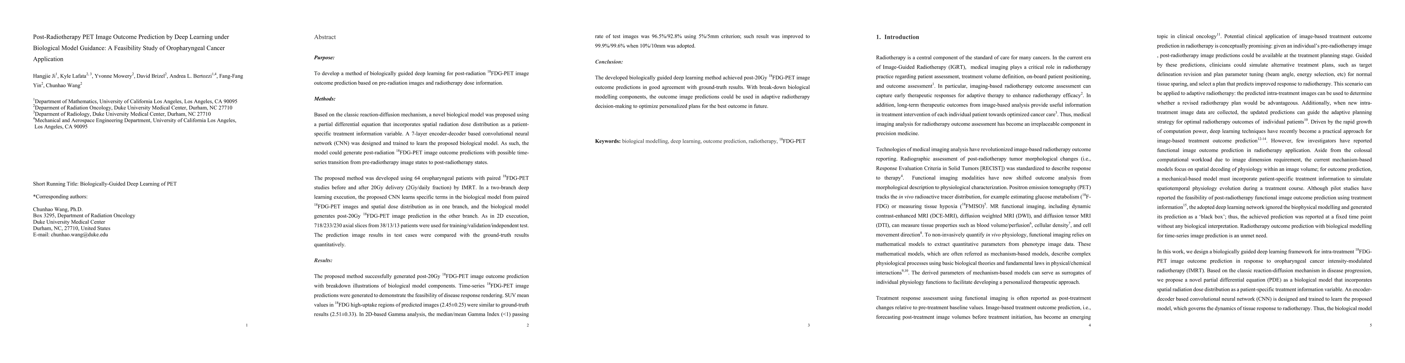 This paper proposes a biologically guided deep learning method using a reaction-diffusion model to predict post-radiotherapy FDG-PET outcomes for oropharyngeal cancer patients. The method combines a CNN with a novel biological model incorporating spatial radiation dose distribution, achieving accurate post-treatment FDG-PET predictions and demonstrating potential for adaptive radiotherapy planning.