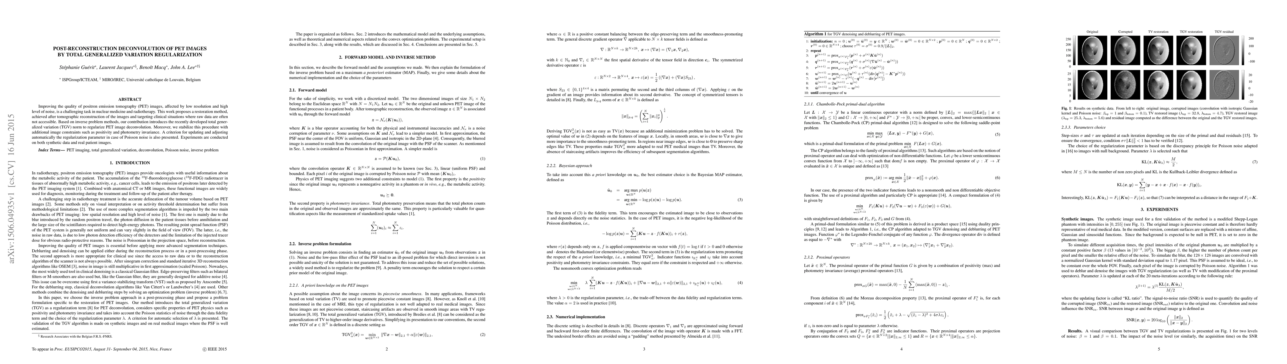 This paper proposes a method for enhancing the quality of PET images using total generalized variation (TGV) regularization after reconstruction, addressing low resolution and high noise. The approach includes additional constraints and an adaptive regularization parameter for Poisson noise, validated on synthetic and real patient data.
