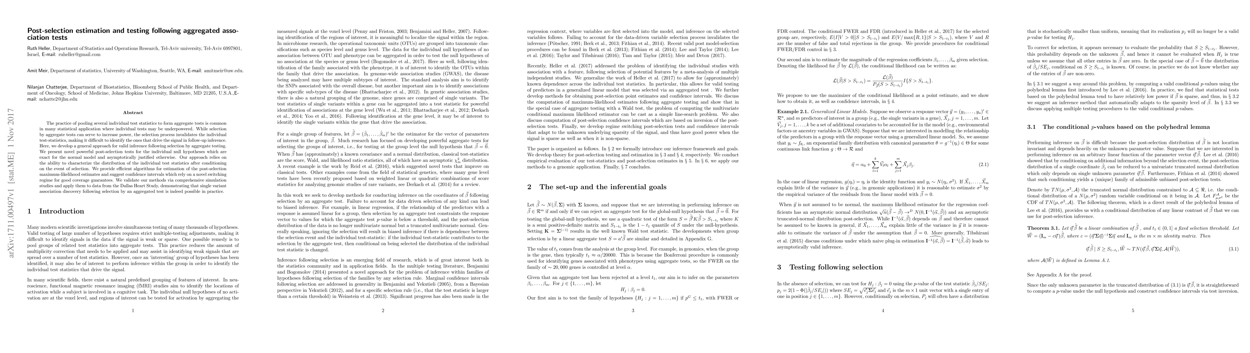 The practice of pooling several individual test statistics to form aggregate tests is common in many statistical application where individual tests may be underpowered. While selection by aggregate tests can serve to increase power, the selection process invalidates the individual test-statistics, making it difficult to identify the ones that drive the signal in follow-up inference. Here, we develop a general approach for valid inference following selection by aggregate testing. We present novel powerful post-selection tests for the individual null hypotheses which are exact for the normal model and asymptotically justified otherwise. Our approach relies on the ability to characterize the distribution of the individual test statistics after conditioning on the event of selection. We provide efficient algorithms for estimation of the post-selection maximum-likelihood estimates and suggest confidence intervals which rely on a novel switching regime for good coverage guarantees. We validate our methods via comprehensive simulation studies and apply them to data from the Dallas Heart Study, demonstrating that single variant association discovery following selection by an aggregated test is indeed possible in practice.