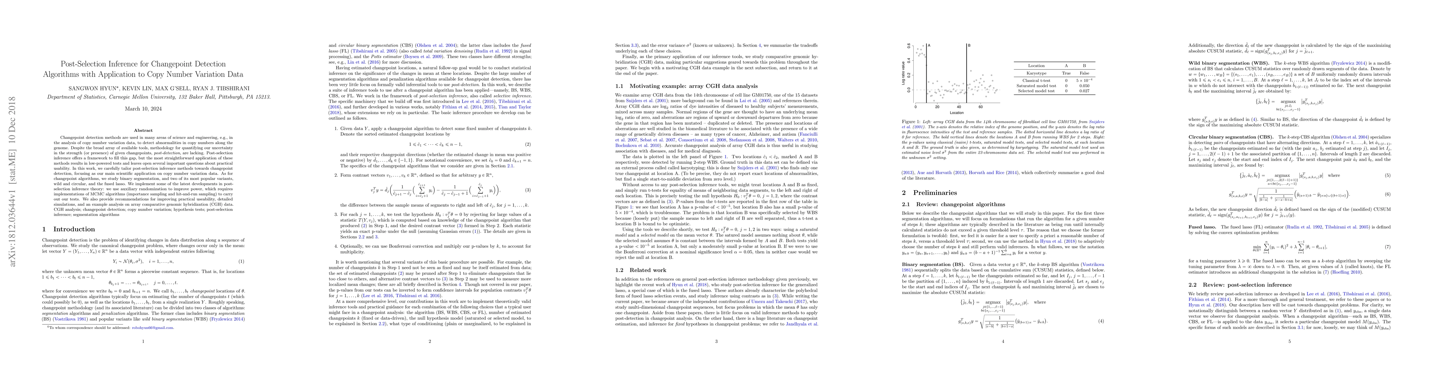 This paper develops tailored post-selection inference methods for changepoint detection algorithms, specifically focusing on binary segmentation variants and the fused lasso, to improve the detection of copy number variations in genomic data. It introduces auxiliary randomization and MCMC algorithms to enhance test power and provides practical recommendations, simulations, and an example analysis on array CGH data.