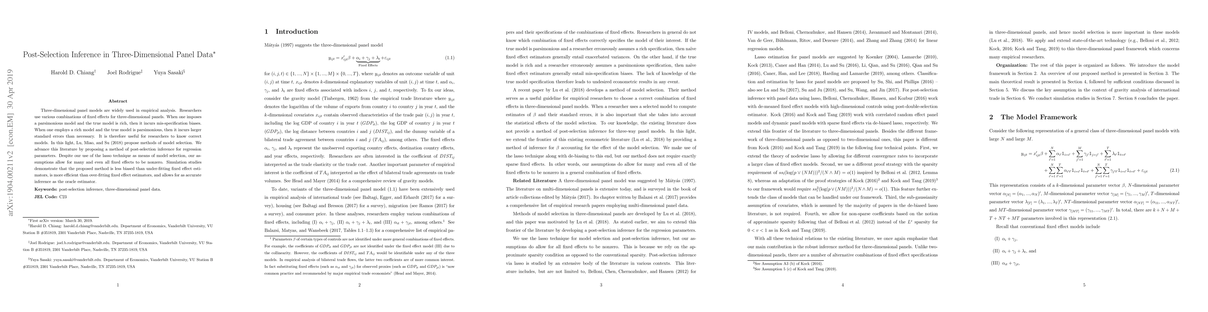 This paper proposes a method of post-selection inference for regression parameters in three-dimensional panel data, utilizing the lasso technique for model selection. The method allows for more accurate and efficient inference compared to under-fitting or over-fitting fixed effect estimators, as demonstrated through simulation studies.