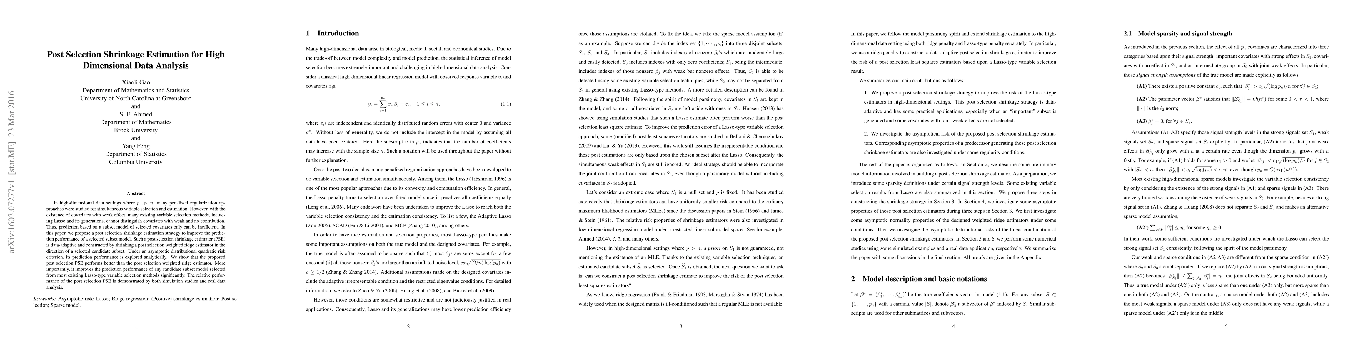 This paper proposes a post selection shrinkage estimation (PSE) strategy to enhance prediction performance in high-dimensional data analysis, where traditional methods like Lasso fail to distinguish weak covariates. The PSE improves upon existing subset models by shrinking a weighted ridge estimator, demonstrating superior prediction performance through simulations and real data analysis.