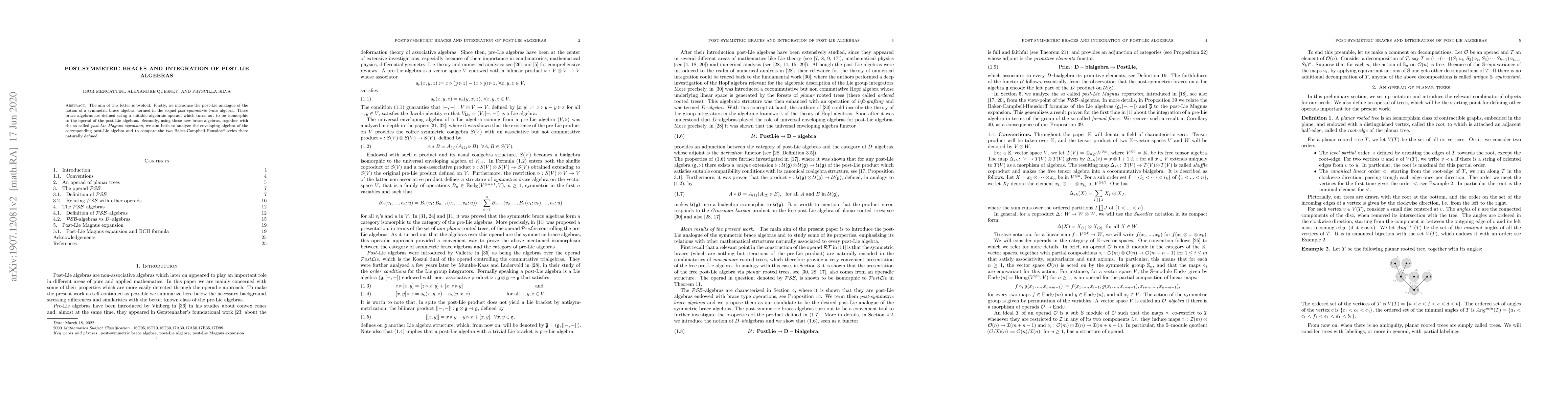 This paper identifies the post-symmetric brace algebras, which serve as the post-Lie analogues of symmetric brace algebras, and explores their significance in the theory of D-algebras, alongside connections to the post-Lie Magnus expansion.