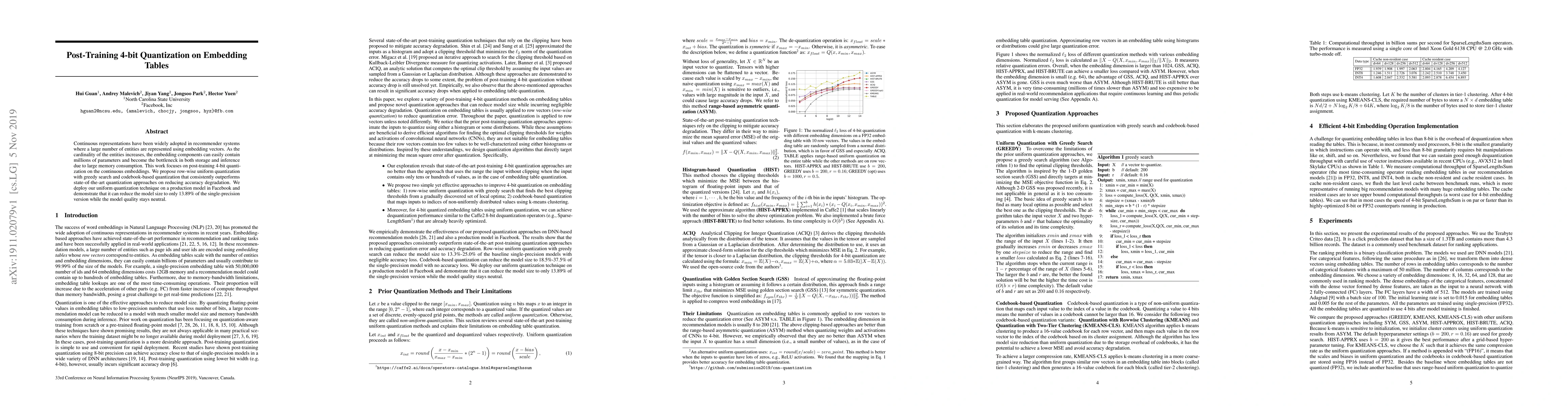 This paper proposes post-training 4-bit quantization techniques for embedding tables in recommender systems to reduce memory consumption without significant loss in model accuracy. The methods, including row-wise uniform quantization and codebook-based quantization, outperform existing approaches and were successfully deployed on a Facebook production model, achieving a 86.11% reduction in model size while maintaining quality.