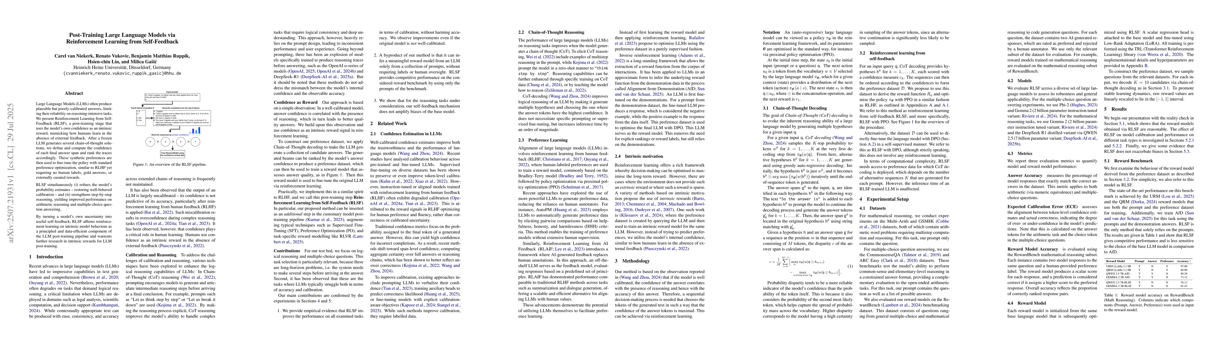 The research introduces Reinforcement Learning from Self-Feedback (RLSF), a post-training stage for Large Language Models (LLMs) that utilizes the model's own confidence as an intrinsic reward, improving calibration and reasoning performance without requiring external feedback or human labels.