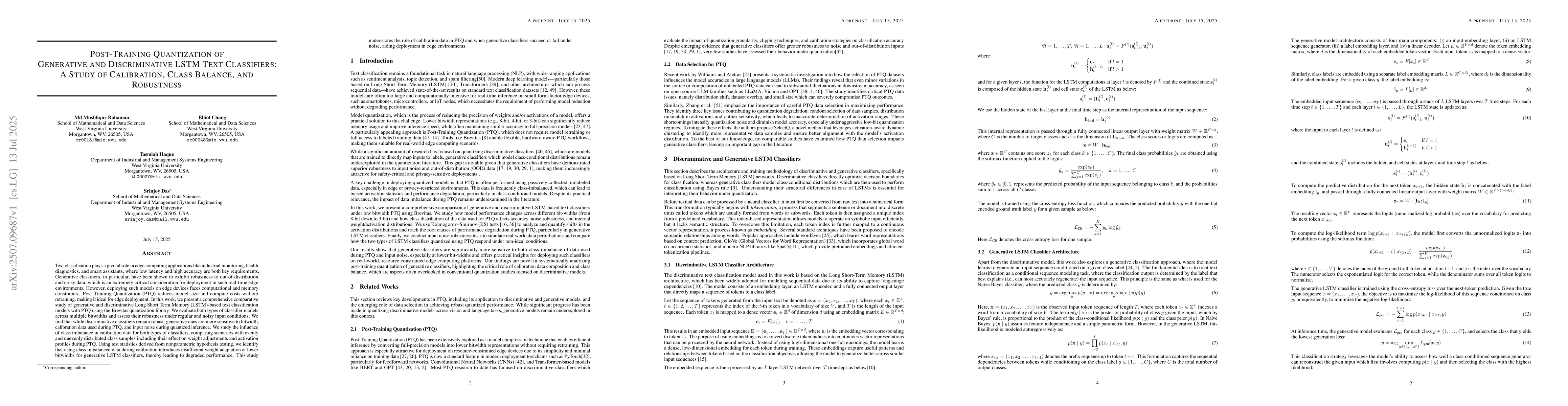 This study compares generative and discriminative LSTM text classifiers post-training quantization (PTQ), finding that while discriminative models maintain robustness, generative models are more sensitive to bitwidth, calibration data, and input noise during quantized inference. Class imbalance in calibration data negatively impacts lower bitwidth performance of generative classifiers, highlighting the importance of calibration data selection for edge deployment of generative models.