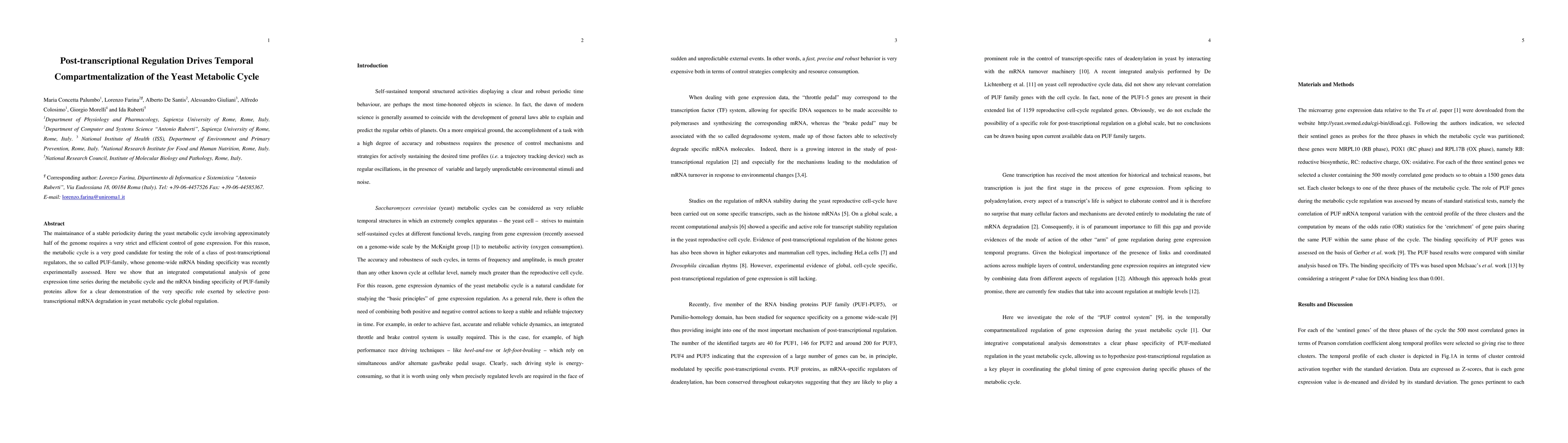 This paper demonstrates that post-transcriptional regulation by PUF-family proteins plays a crucial role in the temporal compartmentalization of the yeast metabolic cycle through selective mRNA degradation. Computational analysis of gene expression and mRNA binding specificity reveals the precise regulatory mechanisms maintaining cycle periodicity.