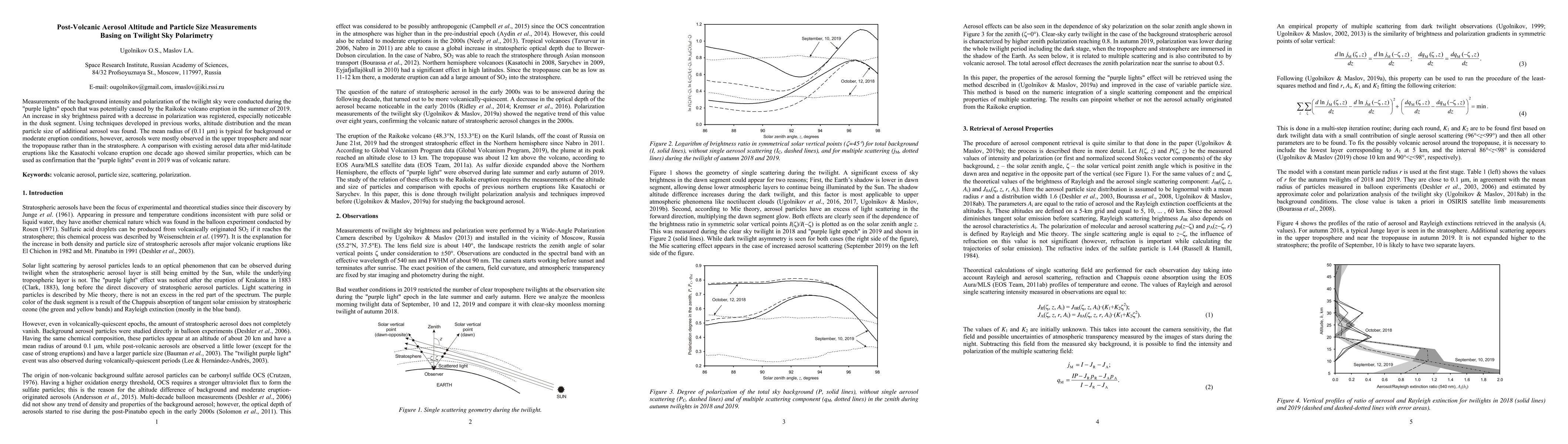 Measurements of the background intensity and polarization of the twilight sky were conducted during the "purple lights" epoch that was potentially caused by the Raikoke volcano eruption in the summer of 2019. An increase in sky brightness paired with a decrease in polarization was registered, especially noticeable in the dusk segment. Using techniques developed in previous works, altitude distribution and the mean particle size of additional aerosol was found. The mean radius of (0.11 micrometers) is typical for background or moderate eruption conditions, however, aerosols were mostly observed in the upper troposphere and near the tropopause rather than in the stratosphere. A comparison with existing aerosol data after mid-latitude eruptions like the Kasatochi volcano eruption one decade ago showed similar properties, which can be used as confirmation that the "purple lights" event in 2019 was of volcanic nature.