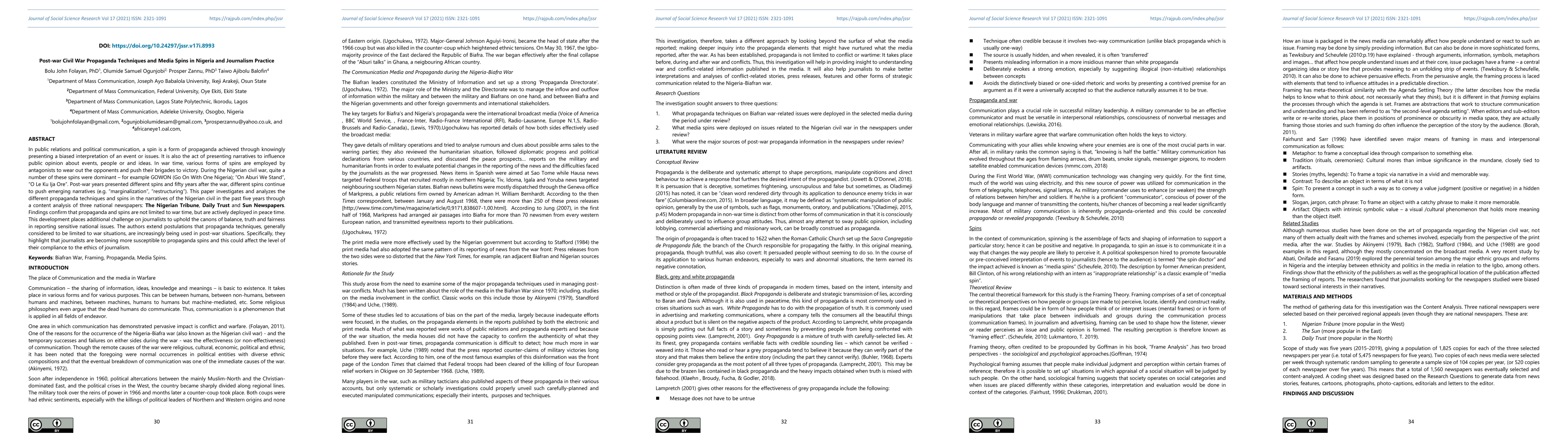 In public relations and political communication, a spin is a form of propaganda achieved through knowingly presenting a biased interpretation of an event or issues. It is also the act of presenting narratives to influence public opinion about events, people or and ideas. In war time, various forms of spins are employed by antagonists to push their brigades to victory and wear out the opponents. During the Nigerian civil war, quite a number of these spins were dominant for example GOWON (Go On With One Nigeria); On Aburi We Stand, O Le Ku Ija Ore. Post-war years presented different spins and fifty years after the war, different spins continue to push emerging narratives (e.g. marginalization, restructuring. This paper investigates and analyzes the different propaganda techniques and spins in the narratives of the Nigerian civil in the past five years through a content analysis of three national newspapers: The Nigerian Tribune, Daily Trust and Sun Newspapers. Findings confirm that propaganda and spins are not limited to war time, but are actively deployed in peace time. This development places additional challenge on journalists to uphold the canons of balance, truth and fairness in reporting sensitive national issues.