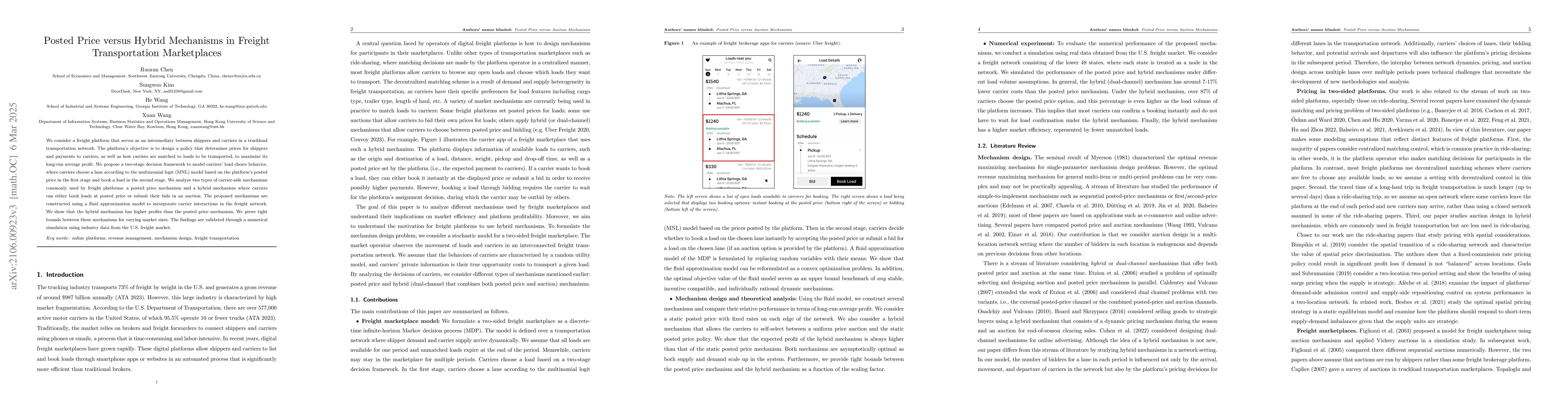 This paper examines freight platforms that connect shippers and carriers, analyzing three carrier-side mechanisms: posted price, auction, and hybrid. The auction mechanism yields the highest expected profits, followed by the hybrid, which balances profit and carrier waiting time, while the posted price mechanism is the least profitable. The study validates these findings using U.S. freight market data.