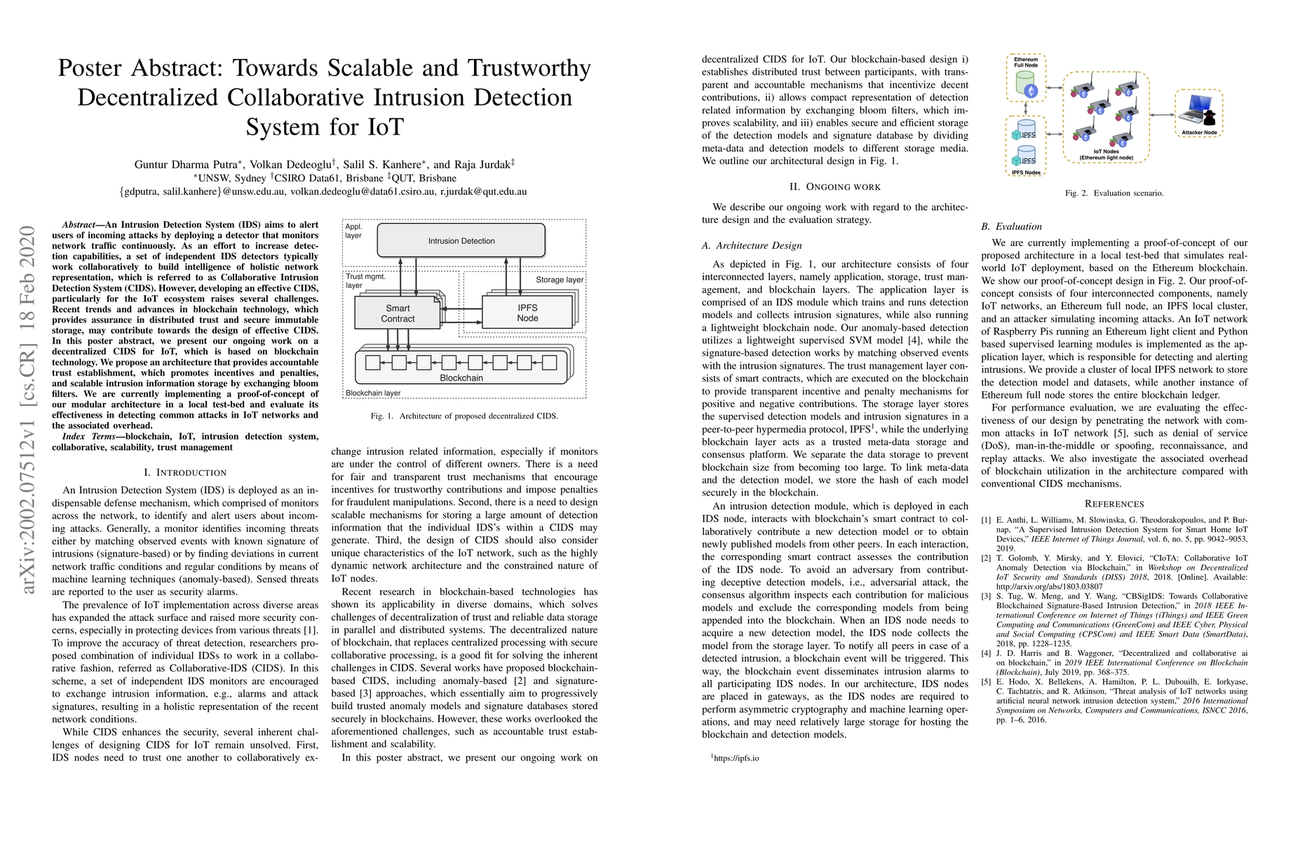 This research proposes a decentralized Collaborative Intrusion Detection System (CIDS) for IoT based on blockchain technology to enhance trust and scalability. The architecture aims to establish accountable trust through incentives and penalties, and uses bloom filters for efficient intrusion information storage.