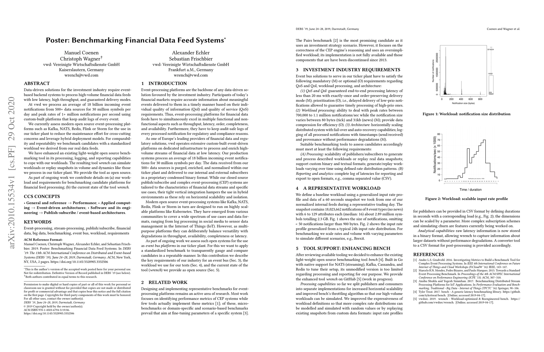Data-driven solutions for the investment industry require event-based backend systems to process high-volume financial data feeds with low latency, high throughput, and guaranteed delivery modes. At vwd we process an average of 18 billion incoming event notifications from 500+ data sources for 30 million symbols per day and peak rates of 1+ million notifications per second using custom-built platforms that keep audit logs of every event. We currently assess modern open source event-processing platforms such as Kafka, NATS, Redis, Flink or Storm for the use in our ticker plant to reduce the maintenance effort for cross-cutting concerns and leverage hybrid deployment models. For comparability and repeatability we benchmark candidates with a standardized workload we derived from our real data feeds. We have enhanced an existing light-weight open source benchmarking tool in its processing, logging, and reporting capabilities to cope with our workloads. The resulting tool wrench can simulate workloads or replay snapshots in volume and dynamics like those we process in our ticker plant. We provide the tool as open source. As part of ongoing work we contribute details on (a) our workload and requirements for benchmarking candidate platforms for financial feed processing; (b) the current state of the tool wrench.