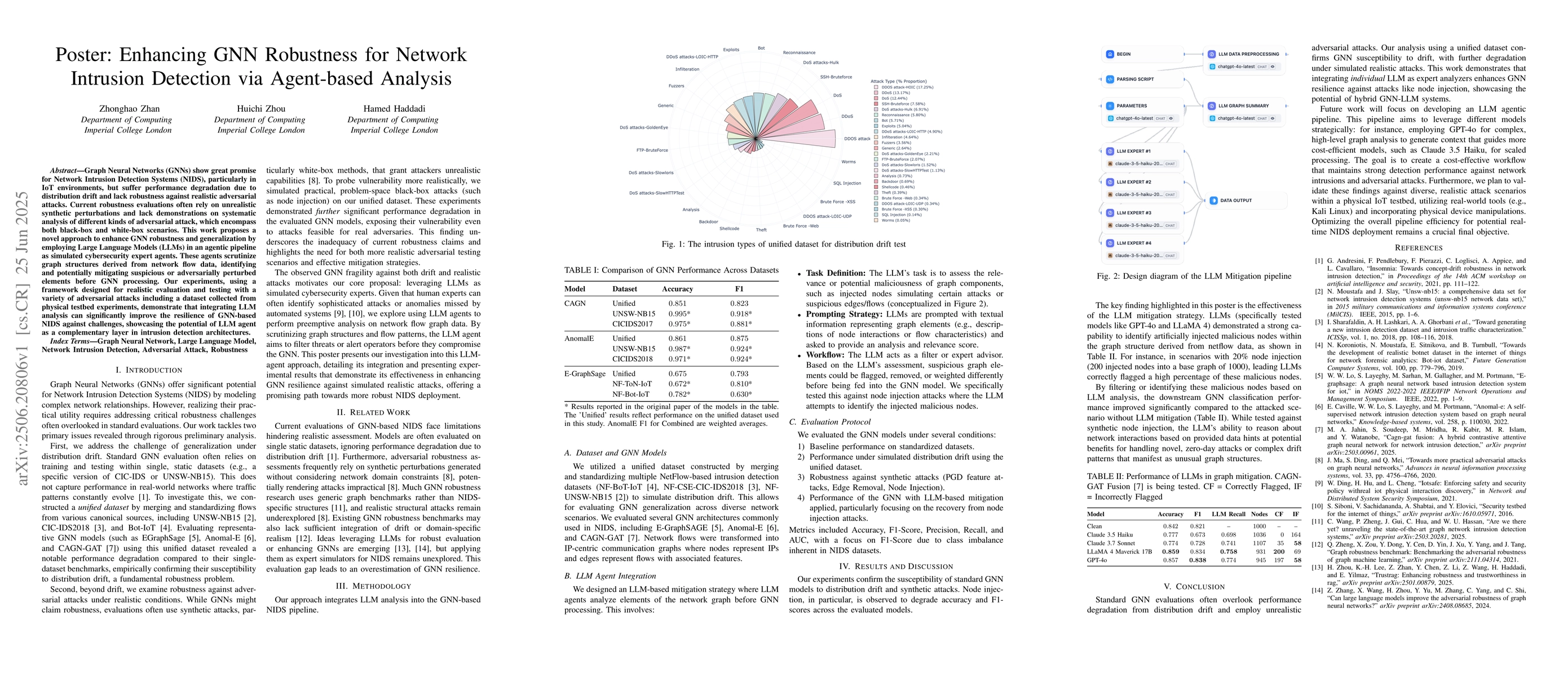Graph Neural Networks (GNNs) show great promise for Network Intrusion Detection Systems (NIDS), particularly in IoT environments, but suffer performance degradation due to distribution drift and lack robustness against realistic adversarial attacks. Current robustness evaluations often rely on unrealistic synthetic perturbations and lack demonstrations on systematic analysis of different kinds of adversarial attack, which encompass both black-box and white-box scenarios. This work proposes a novel approach to enhance GNN robustness and generalization by employing Large Language Models (LLMs) in an agentic pipeline as simulated cybersecurity expert agents. These agents scrutinize graph structures derived from network flow data, identifying and potentially mitigating suspicious or adversarially perturbed elements before GNN processing. Our experiments, using a framework designed for realistic evaluation and testing with a variety of adversarial attacks including a dataset collected from physical testbed experiments, demonstrate that integrating LLM analysis can significantly improve the resilience of GNN-based NIDS against challenges, showcasing the potential of LLM agent as a complementary layer in intrusion detection architectures.