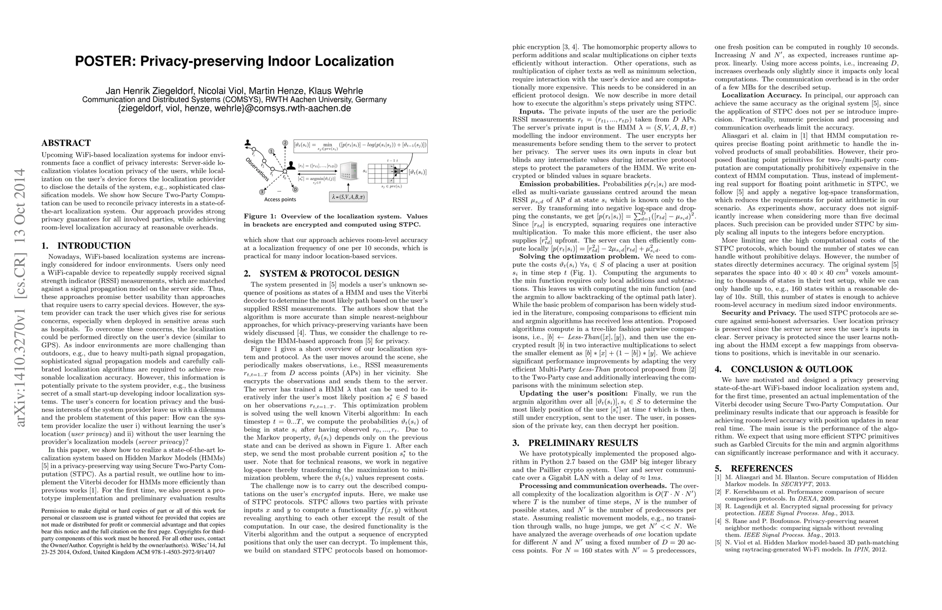 Upcoming WiFi-based localization systems for indoor environments face a conflict of privacy interests: Server-side localization violates location privacy of the users, while localization on the user's device forces the localization provider to disclose the details of the system, e.g., sophisticated classification models. We show how Secure Two-Party Computation can be used to reconcile privacy interests in a state-of-the-art localization system. Our approach provides strong privacy guarantees for all involved parties, while achieving room-level localization accuracy at reasonable overheads.