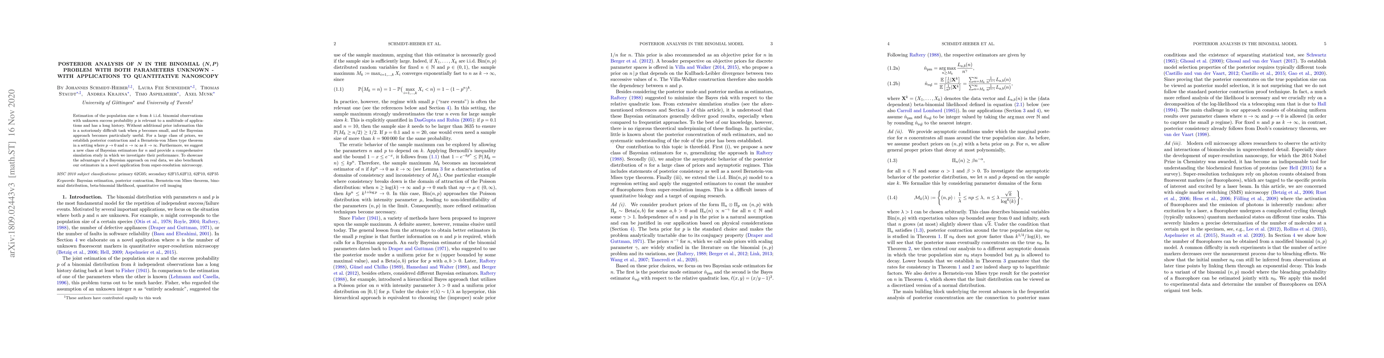Estimation of the population size $n$ from $k$ i.i.d.\ binomial observations with unknown success probability $p$ is relevant to a multitude of applications and has a long history. Without additional prior information this is a notoriously difficult task when $p$ becomes small, and the Bayesian approach becomes particularly useful. For a large class of priors, we establish posterior contraction and a Bernstein-von Mises type theorem in a setting where $p\rightarrow0$ and $n\rightarrow\infty$ as $k\to\infty$. Furthermore, we suggest a new class of Bayesian estimators for $n$ and provide a comprehensive simulation study in which we investigate their performance. To showcase the advantages of a Bayesian approach on real data, we also benchmark our estimators in a novel application from super-resolution microscopy.