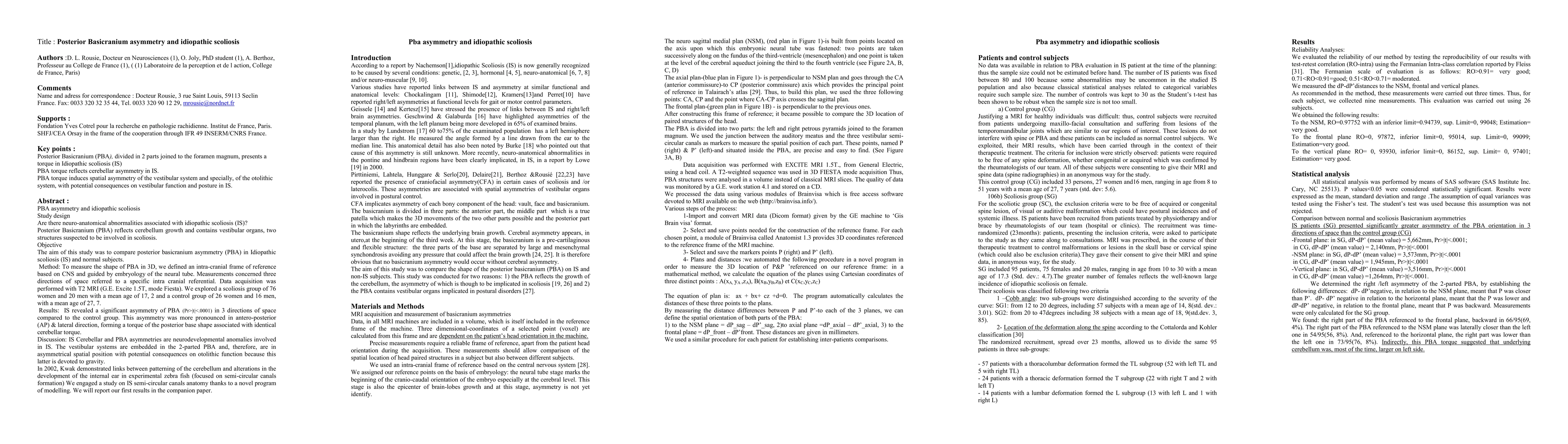 Study design Are there neuro-anatomical abnormalities associated with idiopathic scoliosis (IS)? Posterior Basicranium (PBA) reflects cerebellum growth and contains vestibular organs, two structures suspected to be involved in scoliosis. Objective The aim of this study was to compare posterior basicranium asymmetry (PBA) in Idiopathic scoliosis (IS) and normal subjects. Method: To measure the shape of PBA in 3D, we defined an intra-cranial frame of reference based on CNS and guided by embryology of the neural tube. Measurements concerned three directions of space referred to a specific intra cranial referential. Data acquisition was performed with T2 MRI (G.E. Excite 1.5T, mode Fiesta). We explored a scoliosis group of 76 women and 20 men with a mean age of 17, 2 and a control group of 26 women and 16 men, with a mean age of 27, 7. Results: IS revealed a significant asymmetry of PBA (Pr>|t|<.0001) in 3 directions of space compared to the control group. This asymmetry was more pronounced in antero-posterior (AP) and lateral direction, forming a torque of the posterior base shape associated with identical cerebellar torque.